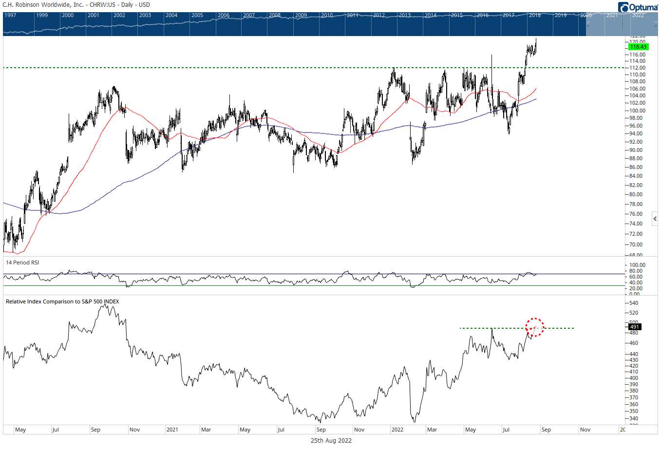 CH Robinson also checks the 52-week absolute and relative highs box. We wouldn’t be dissuaded by today’s candle, simply use $112 as a stop for this transport leader.