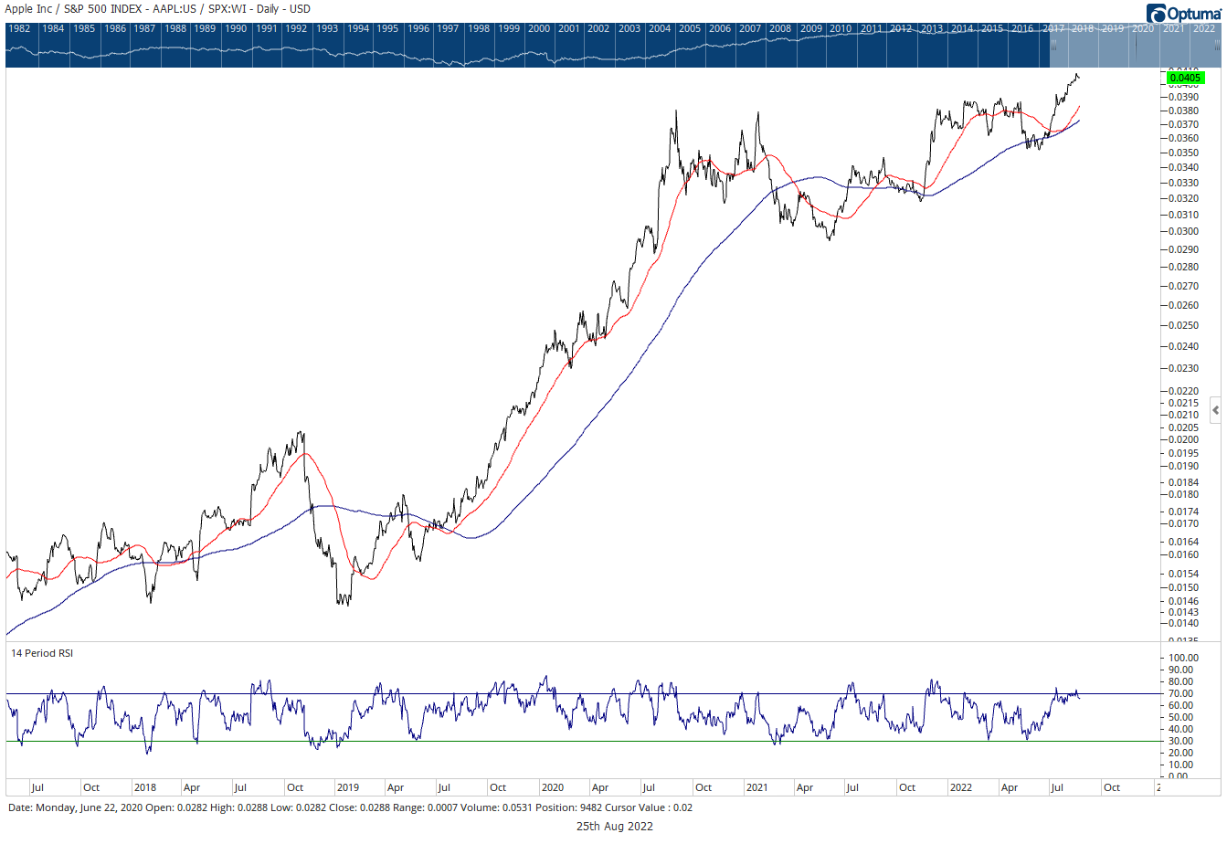 Even more remarkable, is when you look under the hood of this sector, it is top to bottom terrible, despite the fact that it includes everything from Facebook (we will never call it Meta here) to Match.com to Verizon. All have hit 52-week relative lows in recent days. Why not just underweight this sector, and stop trying to bet against Growth, which is 13% this beast? Again, I cannot be more clear. If you say you like value over growth, a tiny part of that bet is that this trend stops. So don’t make it! (Apple vs. the S&P 500 shown).
