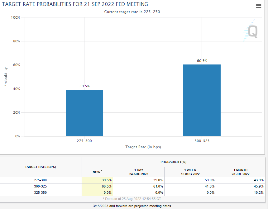 Let’s set the macro stage first. The entire market is glued to whether the Fed hikes 50 or 75 bps in September and market odds show it at still closes to a coin flip, but the odds have flipped from a 60% chance of a 50 to a 60% chance of a 75 in the past week.