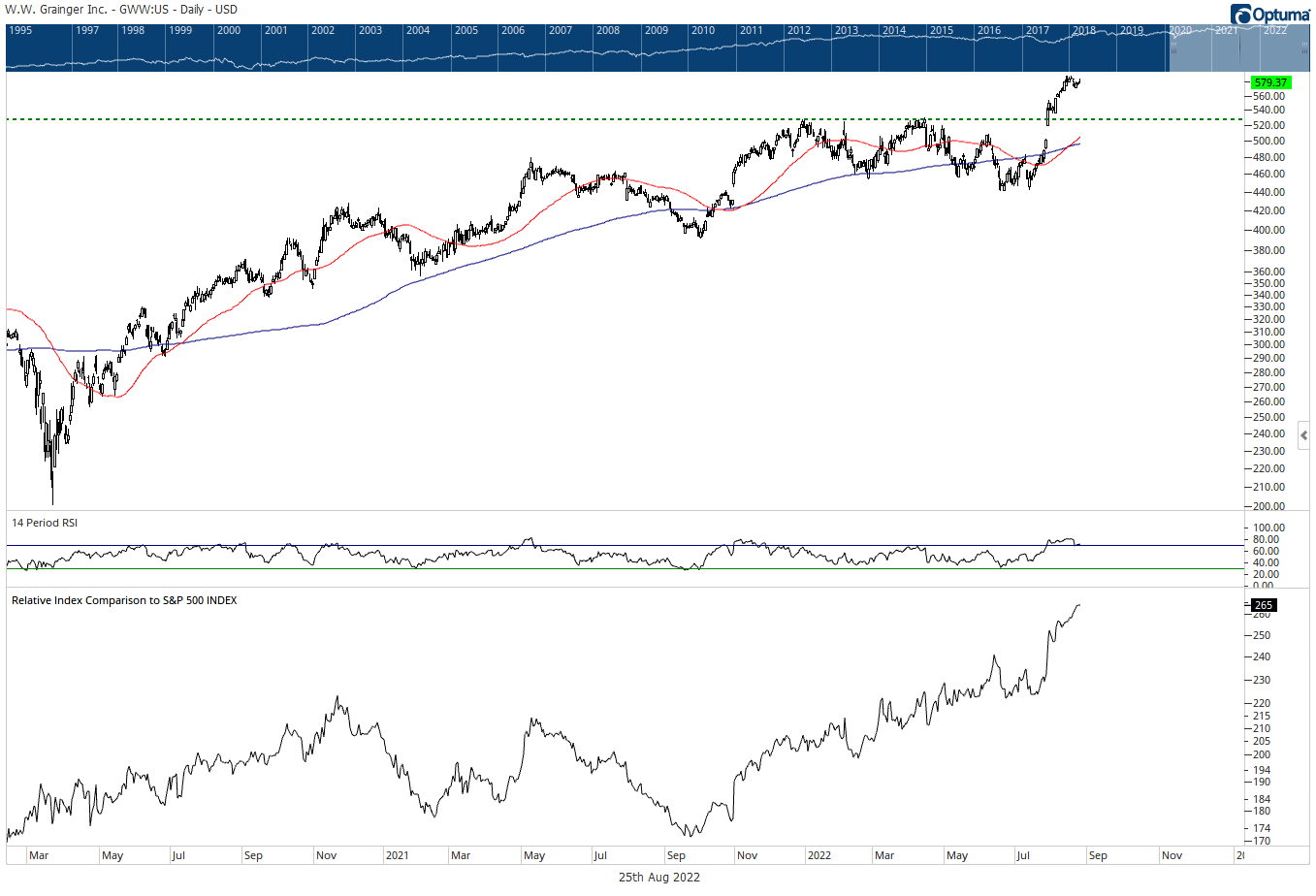 W.W. Grainger (ticker: GWW) is the kind of name we like, sitting right at 52-week absolute and relative highs after a major breakout in late-July. Sure it could pause, but if we’re above $530 the only bet on this one is higher.