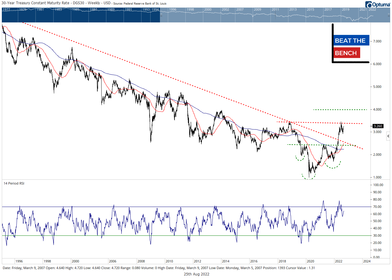 All the Fed speculation is fun and games, but I trust the charts and the terminal rate feeds directly into long-term Treasury yields, along with inflation expectation. As we see with the chart of the 30-year below, the risk remains to the upside and recent action looks like a pause from historically overbought conditions. However, the inverse H&S pattern that is marked targets 4% and if we reaccelerate back above YTD highs we could be there in a second. Don’t let anyone tell you fairy tails about dollar cost averaging in fixed income. If your clients need fixed income, that means that are conservative and need liquidity. Bonds are no place for those with those requirements.