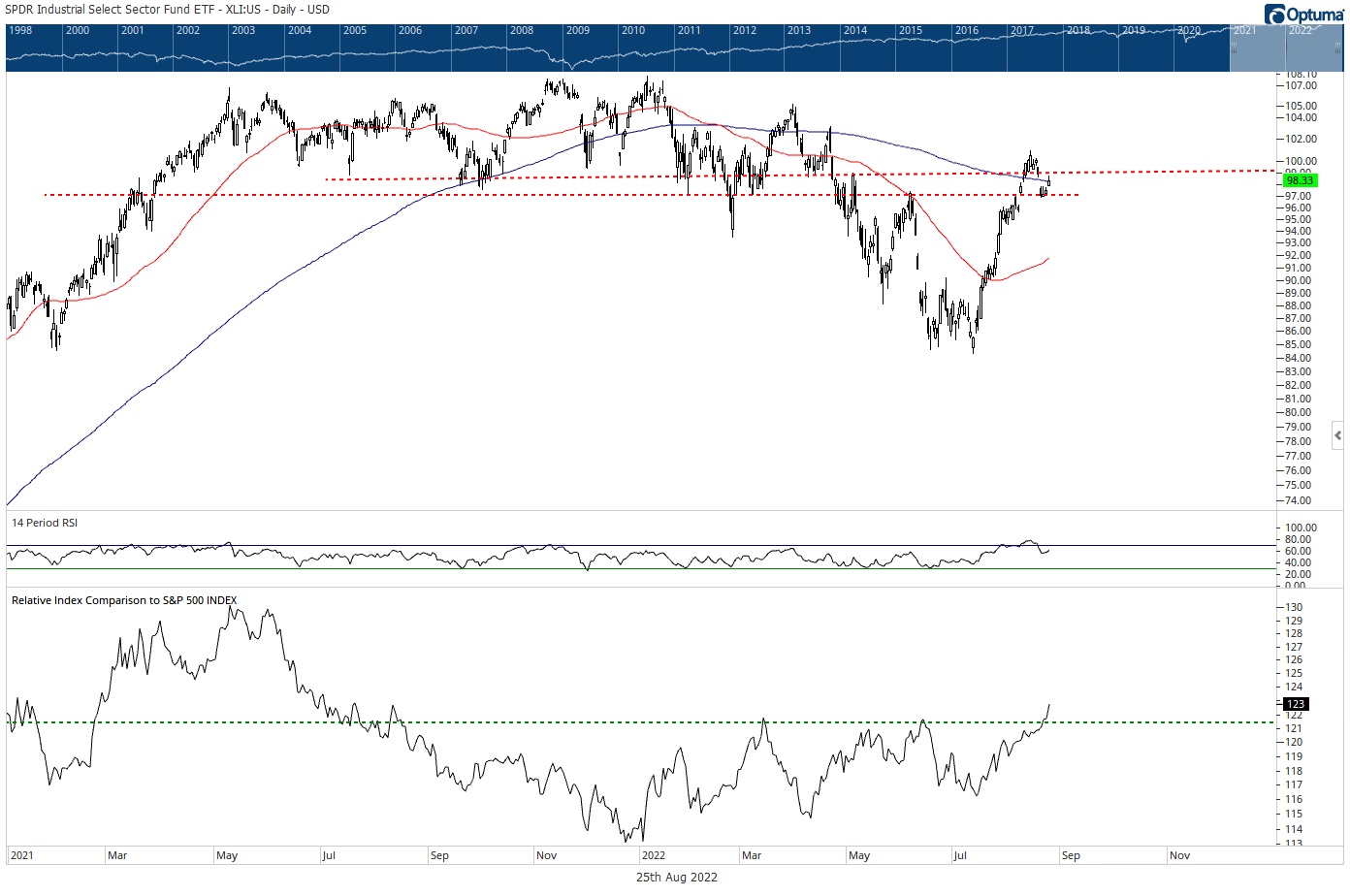 So what sector do you overweight if you are underweighting comm services? I would nominate industrials, which as shown in the bottom panel are breaking out to 52-week relative highs. Sure the absolute chart isn’t great, but we’re trying to add value here, not have a crystal ball. Avoid a sector loser, overweight a winner with strong momentum, rinse and repeat.