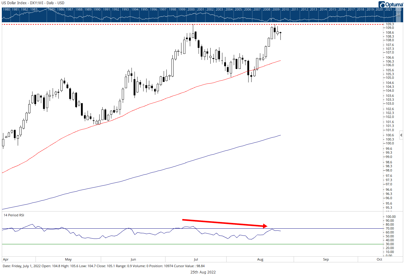 The last major story we want to watch is one that historically has been important for industrials, but right now is critically important for the entire market. The dollar is pushing up towards its July highs, but on weaker momentum than before. The industrials relative breakout may be arguing that this is the end of the line for the dollar, and while we don’t fight trends that look like this, you can save yourself listening to Powell’s speech and just watch the dollar. If it pushes up through 109, he said something the market didn’t like and expect risk assets to sell-off. However, currency markets may be expecting something more dovish and any relief in the dollar rally would be welcome news for the bulls.