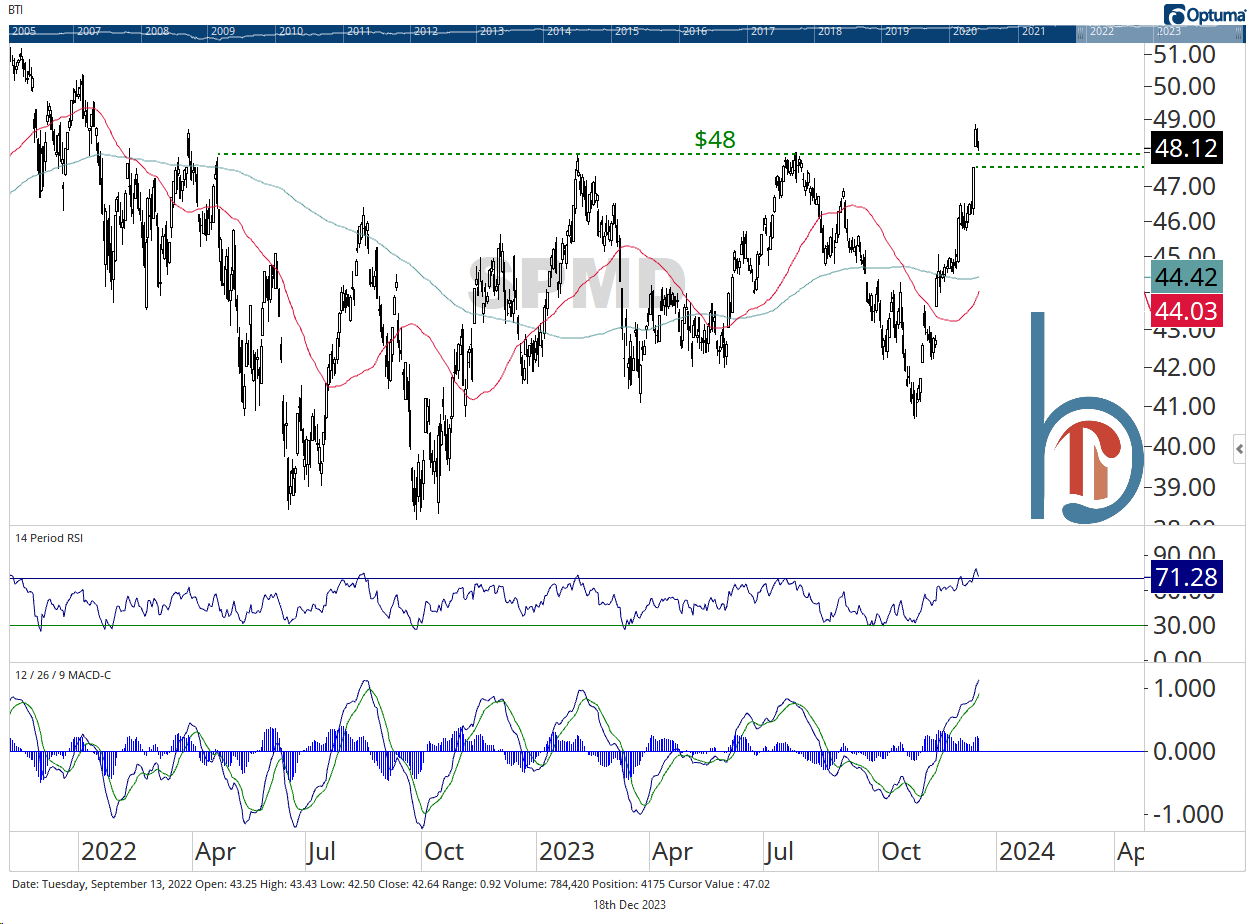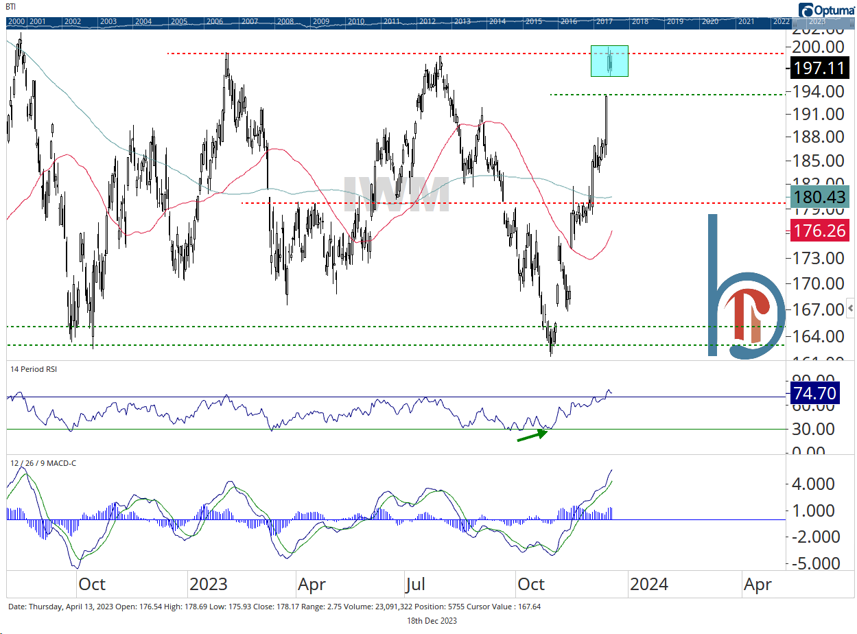Zooming in from yesterday’s Playbook chart, the Russell 2000 has now spent 3 days suspended just below resistance. We really need to see a strong close above $200 here to say the ETF has broken out, while any downward movement ($195.95 was Friday’s low) risks a gap fill. However, whenever we can break out, the measured target is $235.
