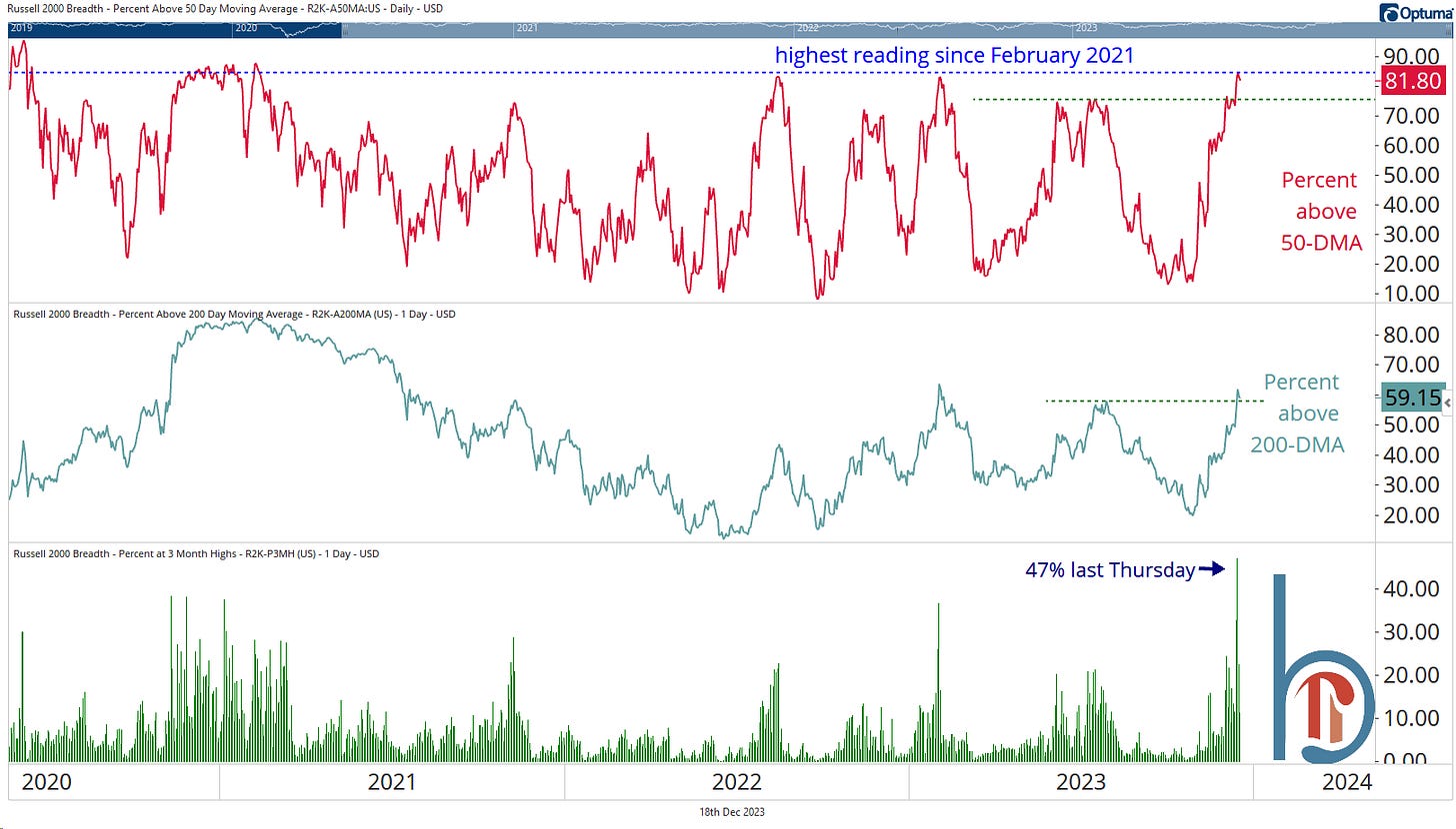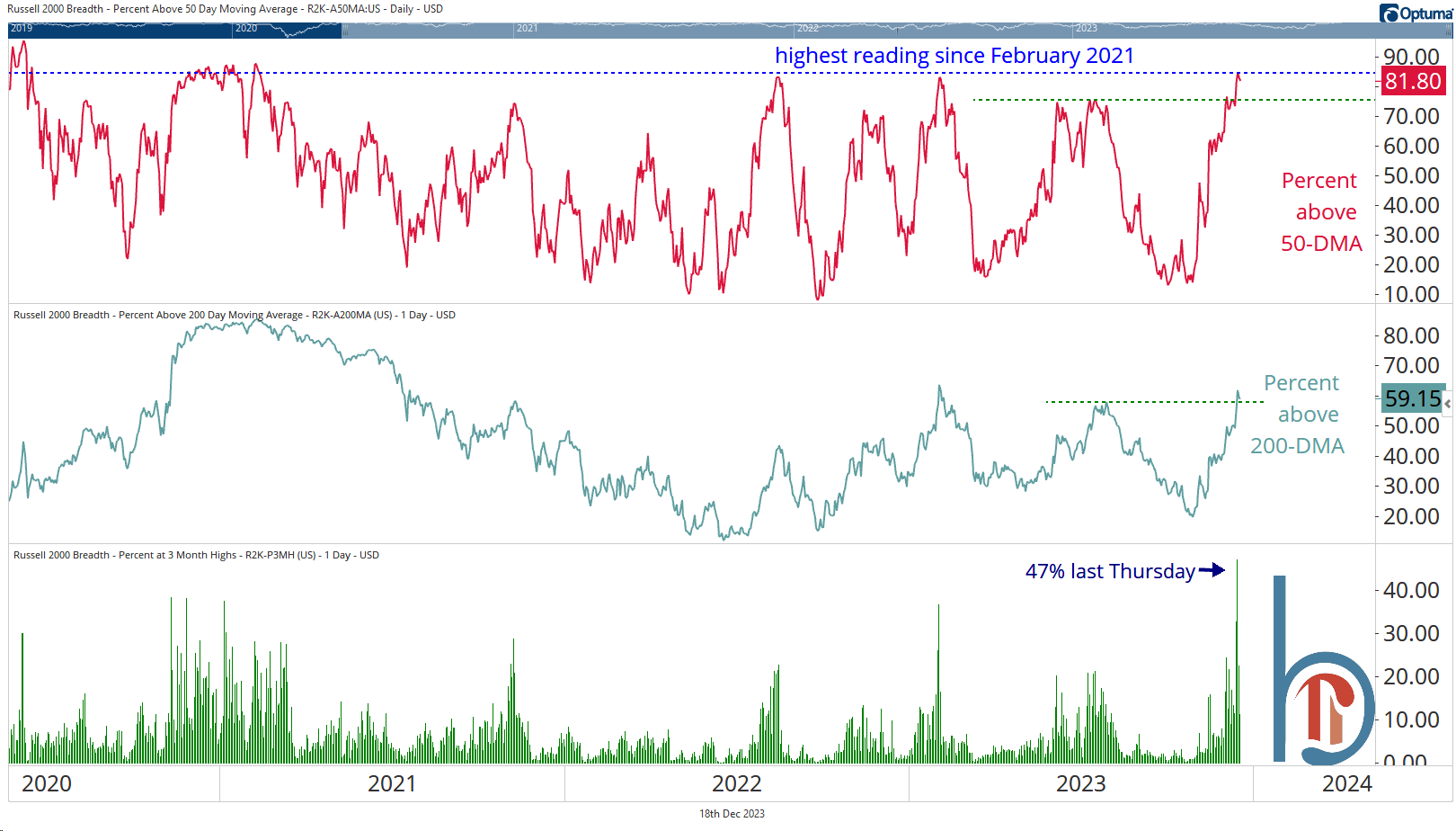 Small caps may be pulling back at the top of their range, but breadth leads price and the new high data says the Russell will break through. An astounding 47% of the index traded to a new 3-month high last Thursday (the 5th highest reading on record since 1990) and the percent of components above their 50-DMA just hit the highest level since the bear market started.