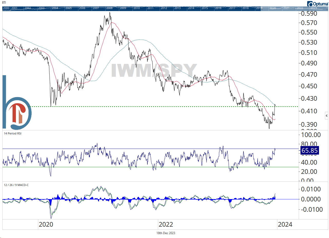 Small-caps outperformed large by 9.6% from November 10 through last Thursday. That’s a solid surge but we have to respect that the trend still favors large. The IWM:SPY ratio is back above broken support, but running into a downward-sloping 200-DMA. As someone benchmarked to the S&P 500, I would prefer to focus on leadership groups within small-caps, as a broad allocation just isn’t supported by technical trends yet.