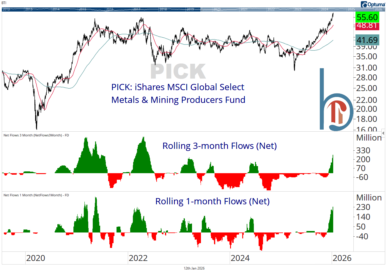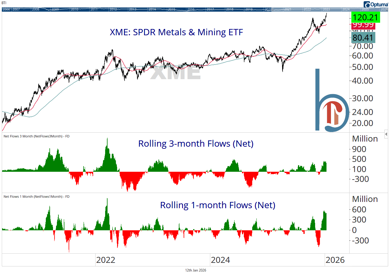 Contrarian positive. These ETFs have seen significant outflows recently and extreme readings could indicate selling is unlikely to continue to the same degree. Potential tailwind if a downtrend can stabilize and a bullish indicator for uptrends or ETFs breaking out.
