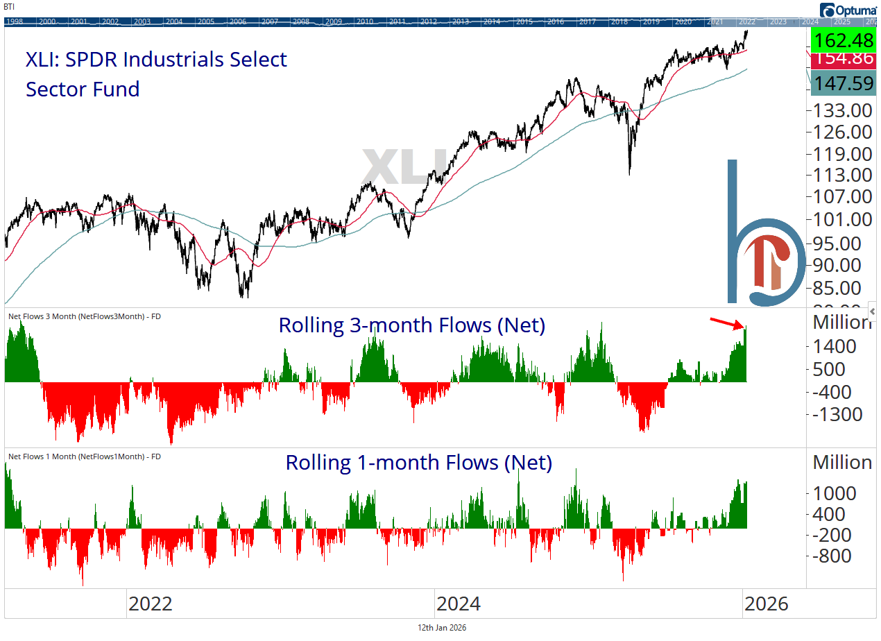 I’m surprised to see industrials here because XLI only really broke out from a six-month trading range last Monday. Nevertheless, both 1 and 3-month inflows are at multi-year highs, suggesting a tactical risk to sustaining the recent outperformance.