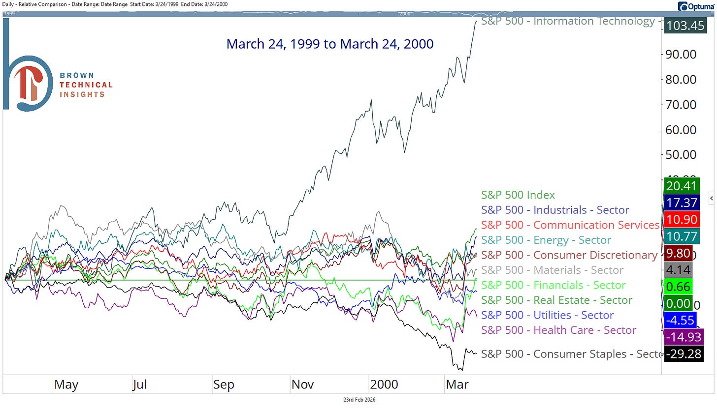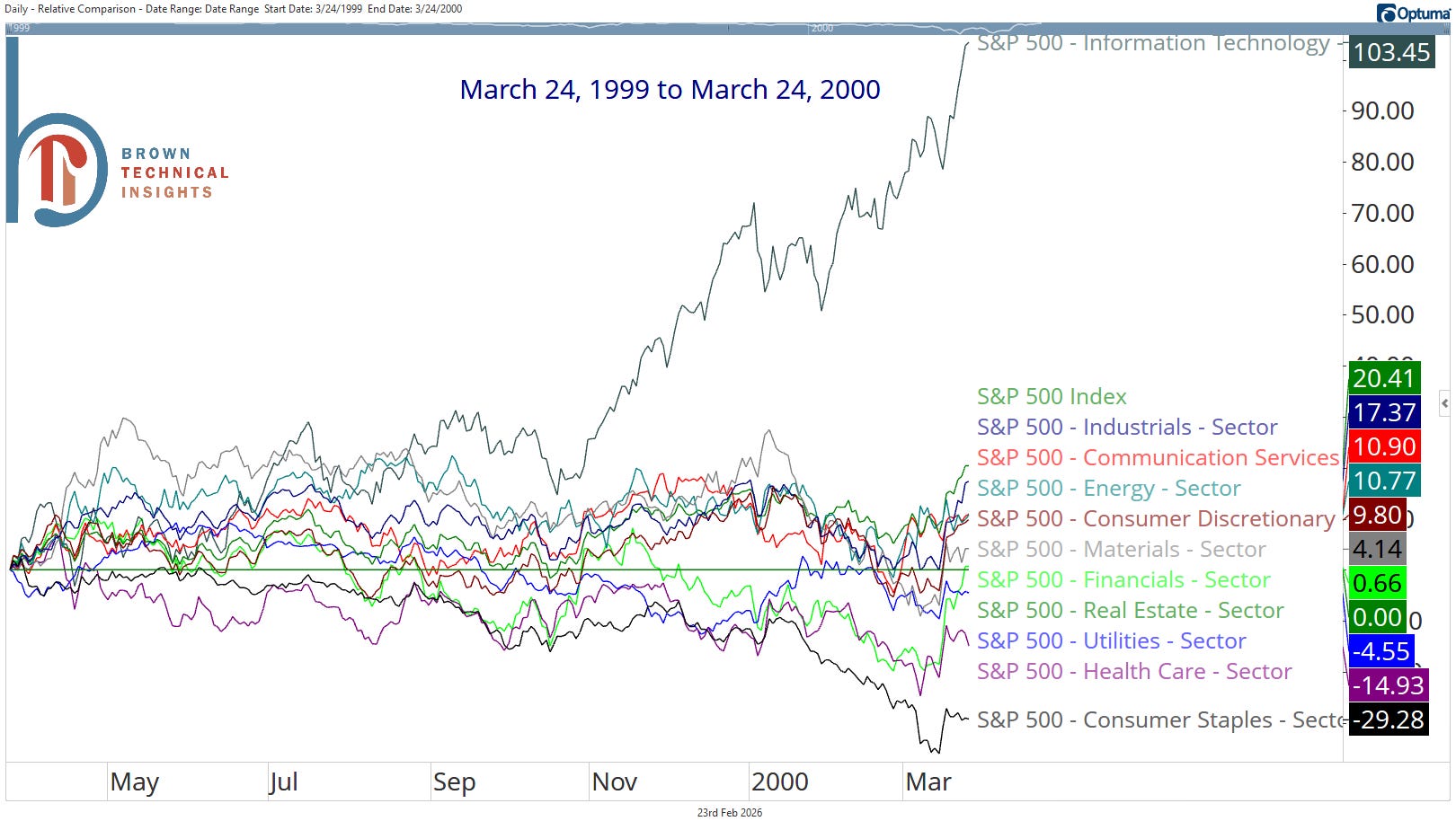 The dot-com bubble is perhaps the exception that proves the rule. The issue with the tech bubble was a breadth one, as you can see almost every sector besides tech declining in the six months ahead of the top. However, I would note that in the year following the market top, you saw classic defensive leadership, and energy positive (+5.7%), and in the number 4 spot: