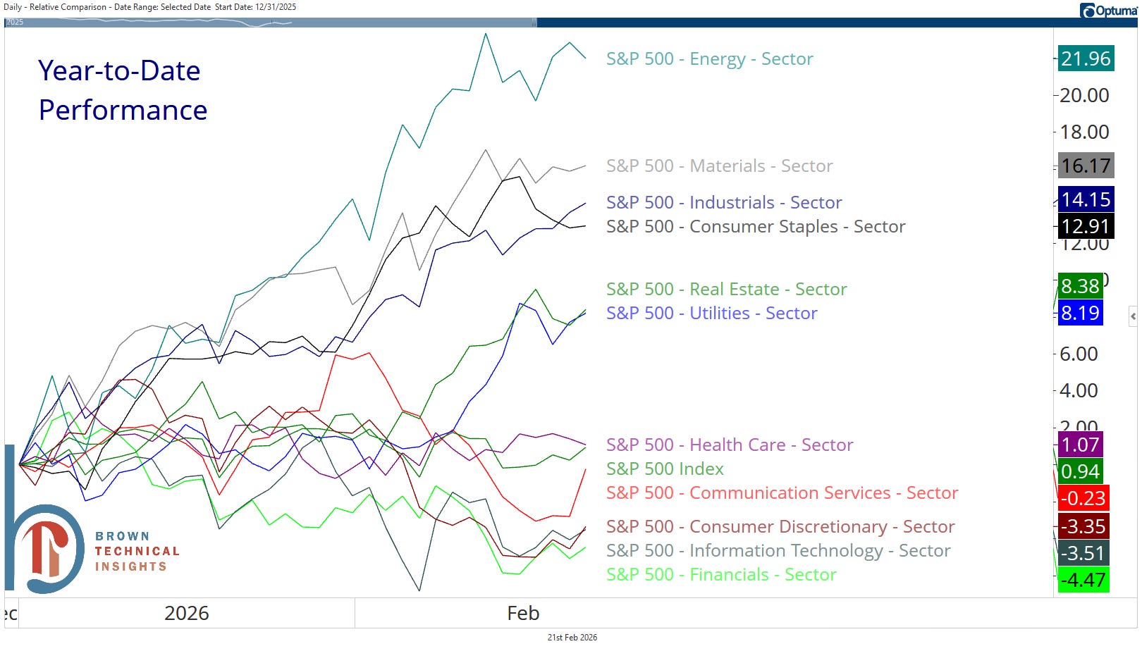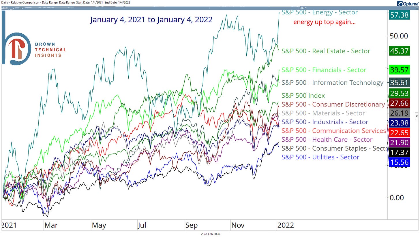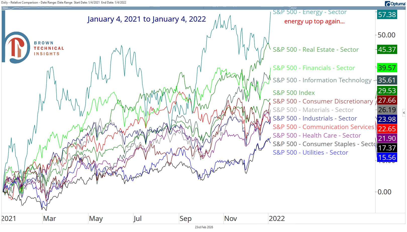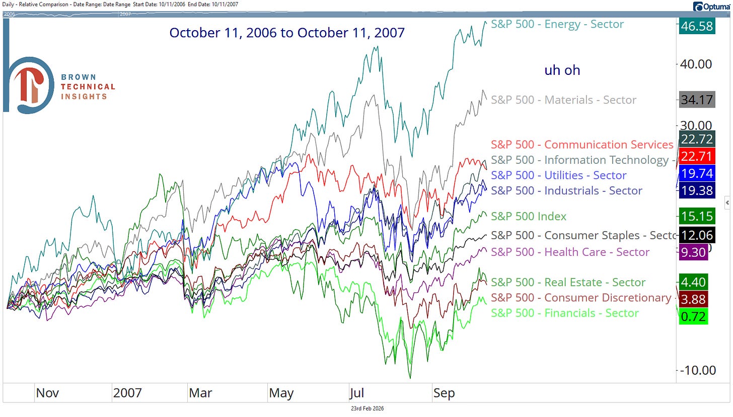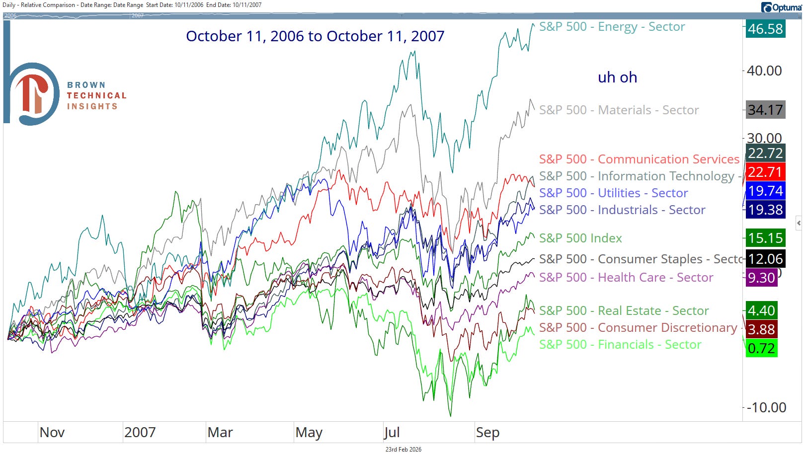 Can you show some charts of sector leadership ahead of major tops? Have energy, materials, and industrials (all classical cyclicals that are leading YTD) been leaders into sharp or sustained downdrafts?