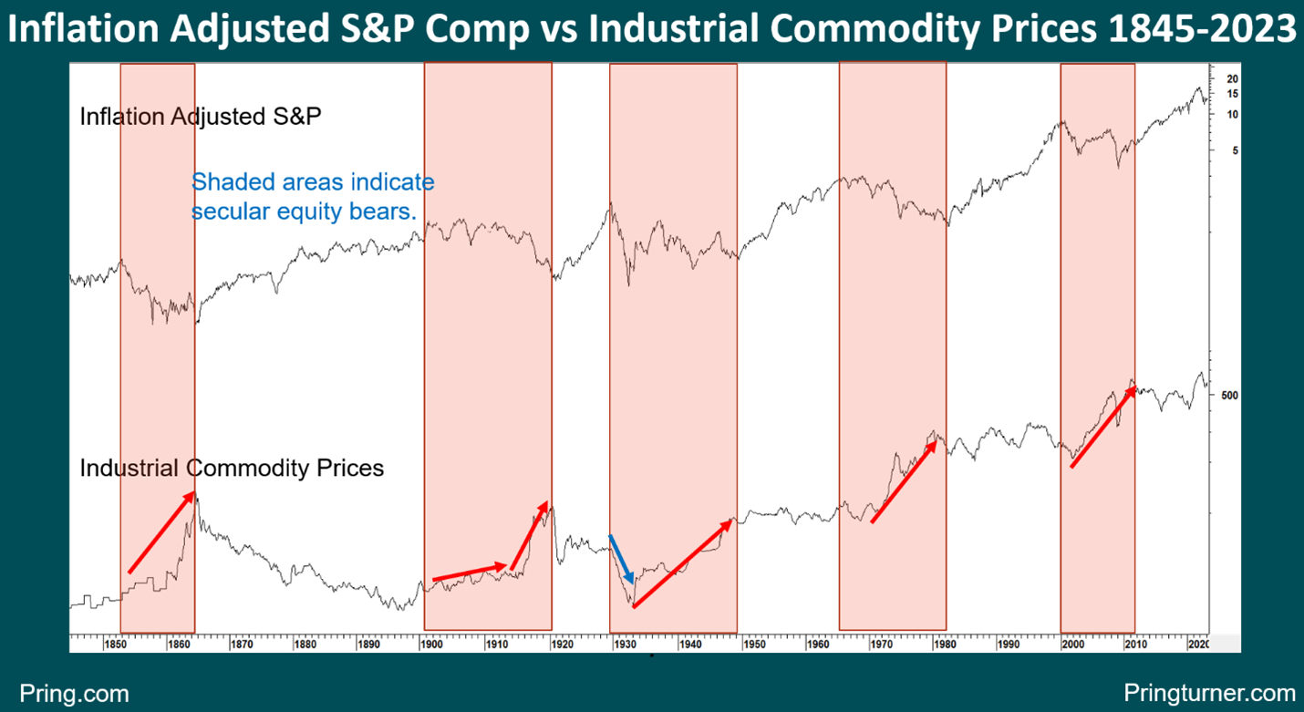 He shows us that nearly all secular bear markets since 1845 have been associated with sharply rising commodity prices.