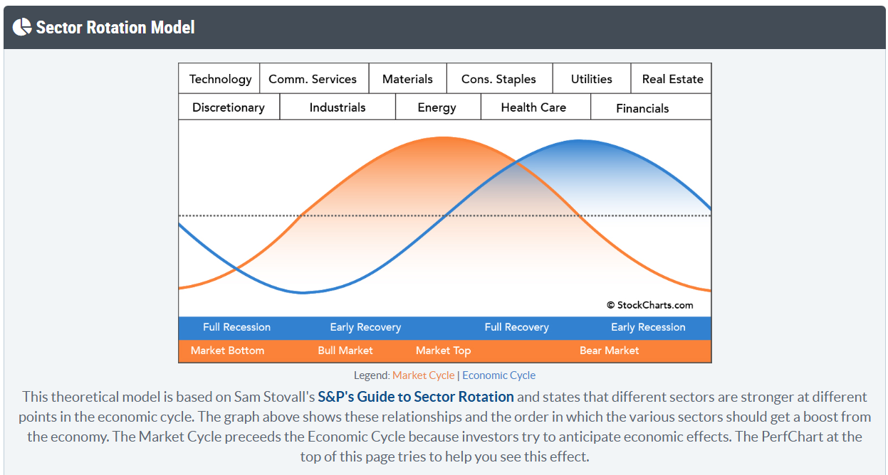 Below is Sam Stovall’s S&P Guide to Sector Rotation, courtesy of StockCharts.com.