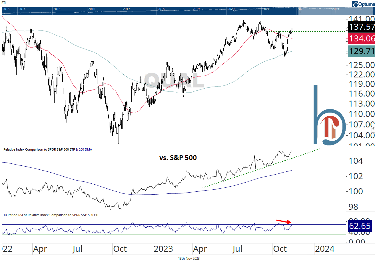 The quality factor isn’t all tech by any means, but its chart pattern certainly bears a strong resemblance to XLK. We’ve all heard the fundamental reason that people have flocked to the Magnificent 7 is those strong balance sheets and frankly, this supports that. The relative trend is incredibly strong but is showing a bearish divergence on its most recent new highs.