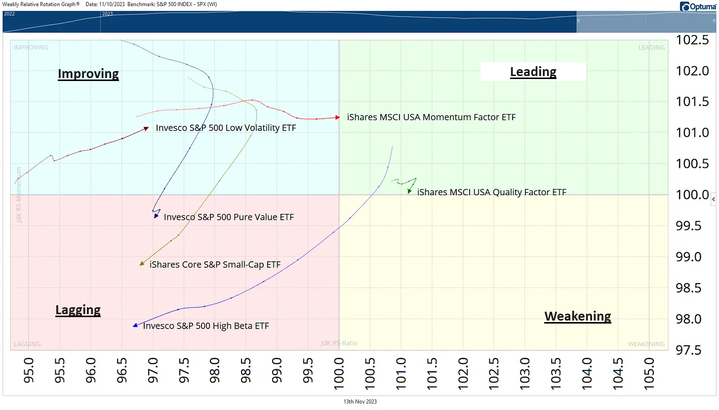 Please note, the charts we’re using today feature momentum for the factor relative to the S&P 500 because we’re most interested in what is working vs. the absolute technicals.