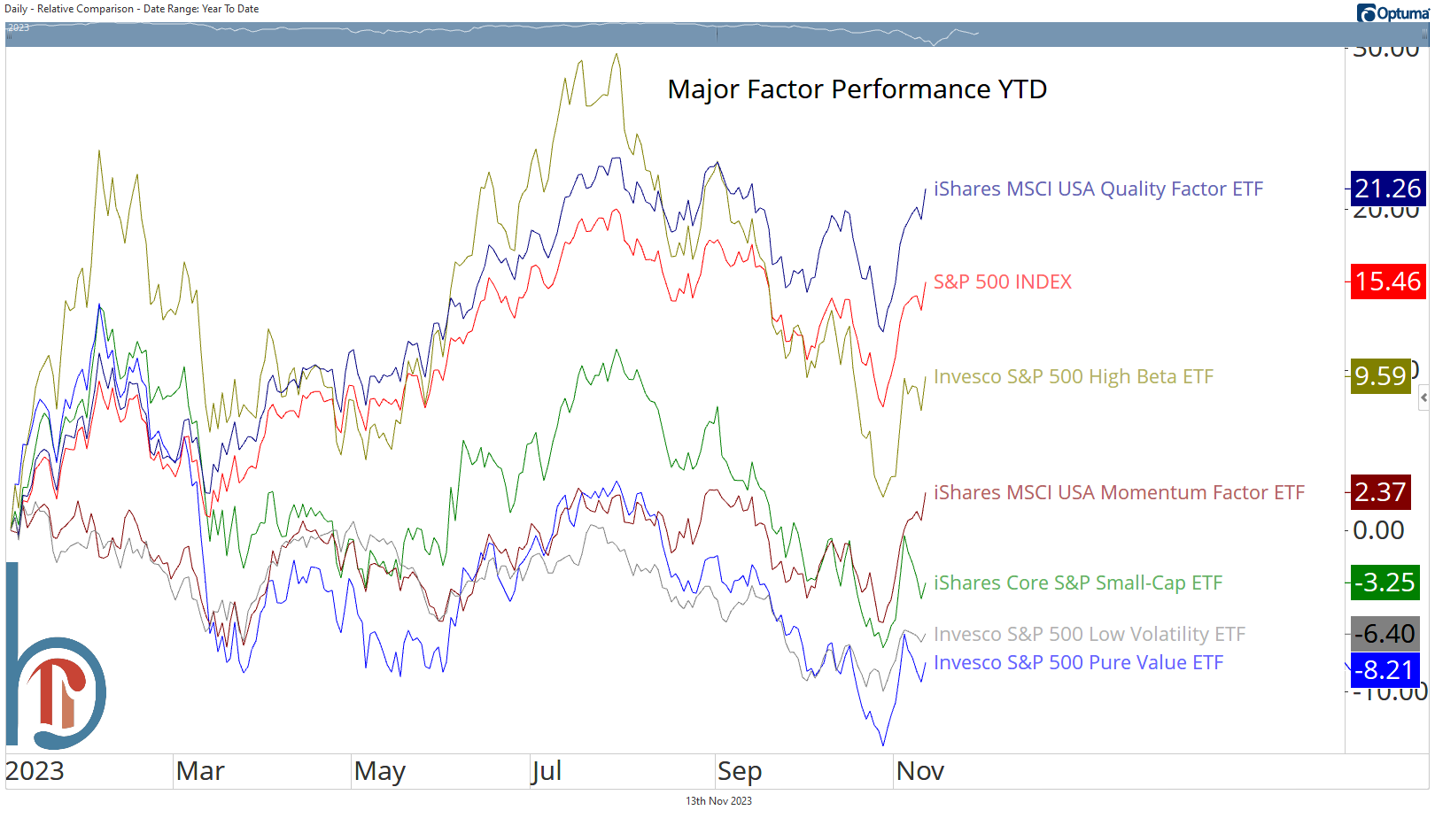 Of the 6 major factors we’re looking at today, only quality has outperformed the S&P 500 year to date. The rest are not just lagging, but 3 are outright negative.