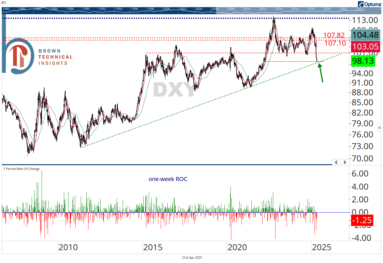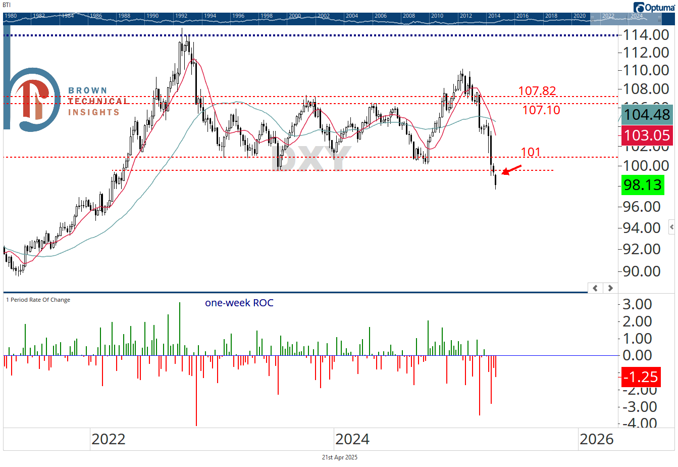 Last Monday, I pointed out that the DXY was extremely oversold based on its 3-month rate of change. And in the five trading days since, it has gone on to lose an additional 2%, including 1.25% yesterday. We may be oversold but now that we’ve broken support at 101, the operating assumption has to be there is more risk to the downside.