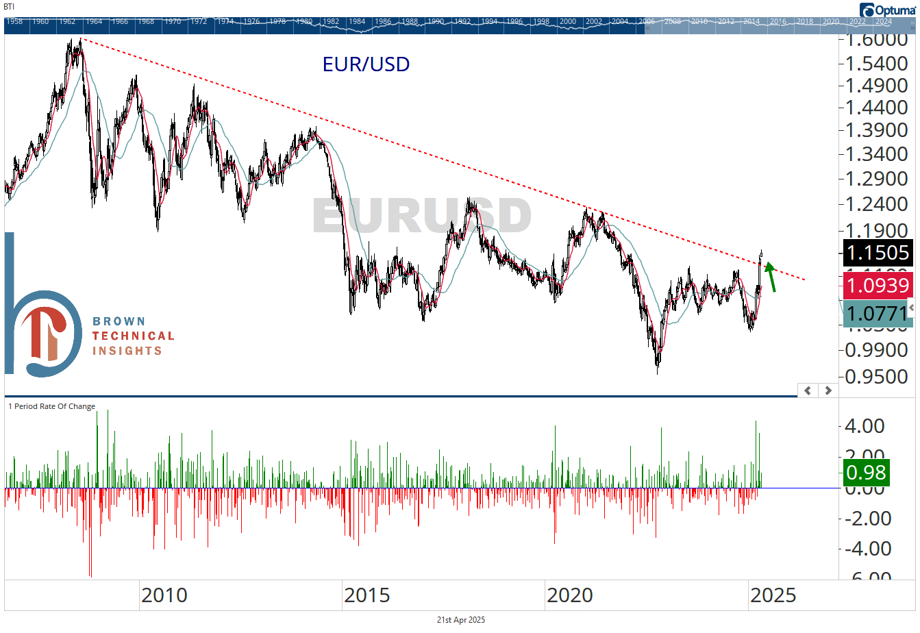 I’ve seen some people point out this long-term uptrend line, unfortunately, I wouldn’t get too excited about it. The DXY’s largest component (the euro) has already taken out its 17-year downtrend line 👇