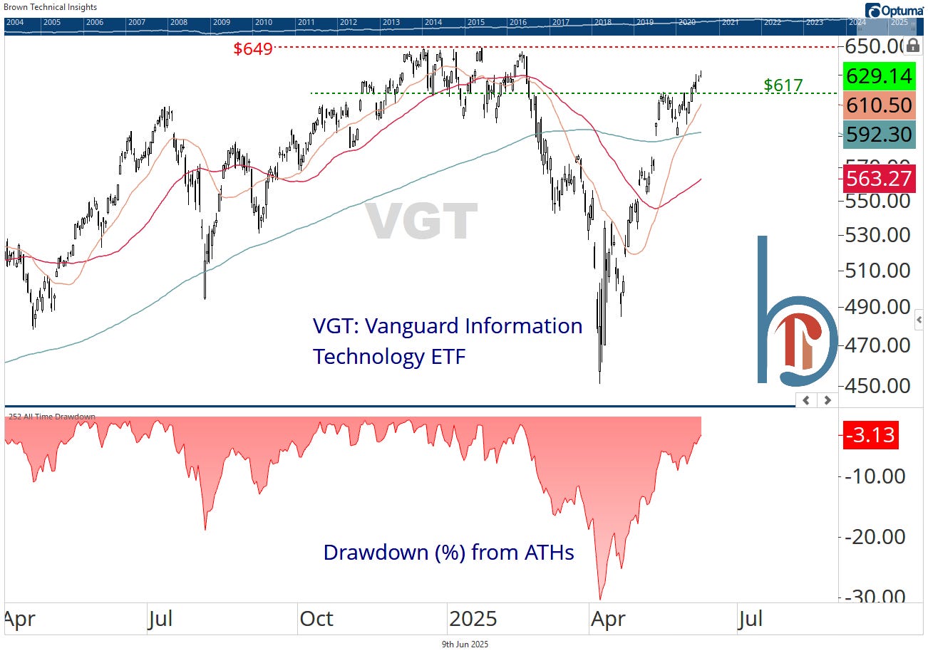 Down 30% from all-time highs just two months ago, VGT is now just 3% away. $649 was strong resistance for three months at the turn of the year and we could see some digestion here. But late May saw a successful retest of the 200-DMA, and last week saw a short-term breakout, so my base case is that new all-time highs are in the cards before we see any material downside.