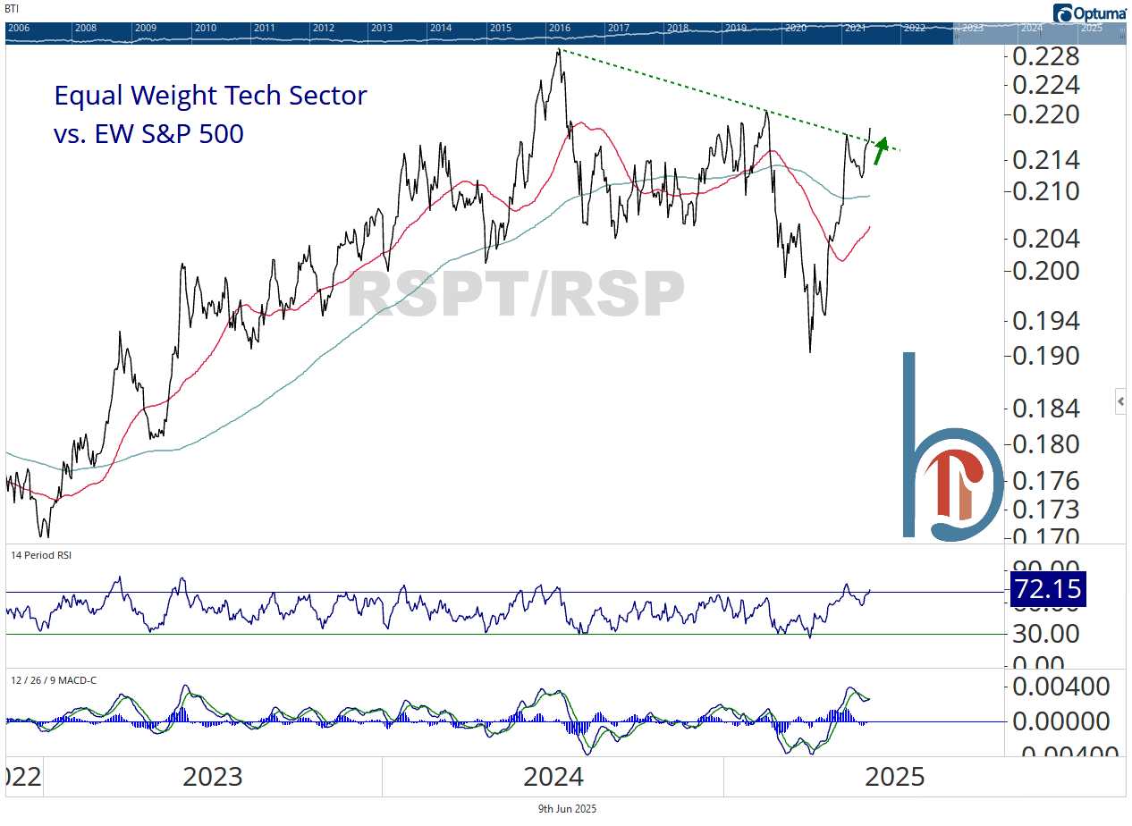And this isn’t just about those top stocks. The equal-weight tech sector just broke out vs. the equal-weight S&P 500.