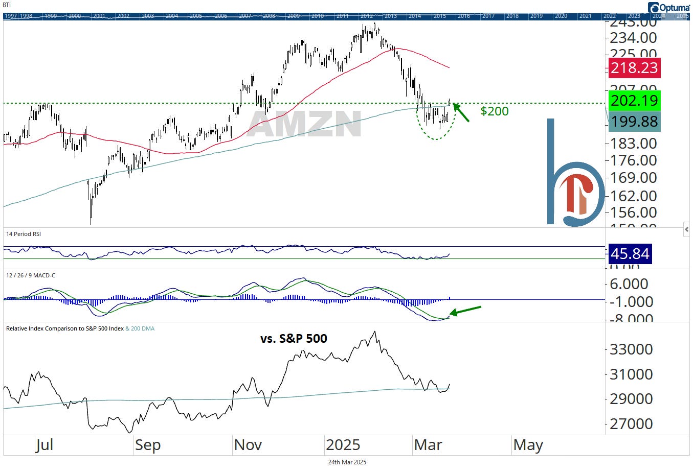 Amazon popped more than 3% yesterday, gapping back above its 200-DMA and the key $200 level. This looks like a failed breakdown to me and I’m a buyer with the March $189 lows as a stop.