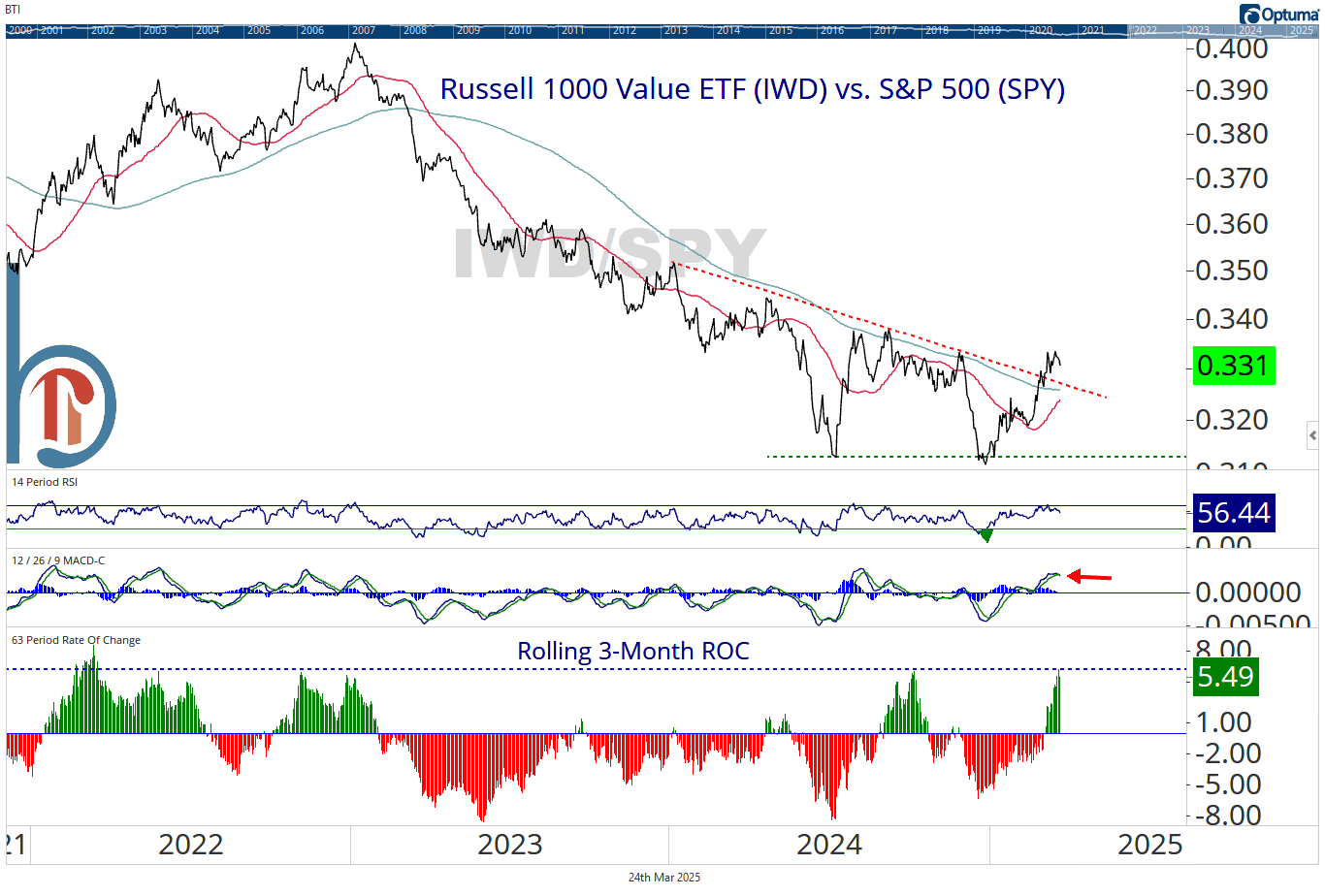 I believe this ultimately comes down to time horizon and intentions. If this is something you are determined to do, it could be an opportune time. Value has just had its best 3-month run of outperformance vs. SPY since 2022 and the MACD just registered a sell signal (favoring SPY) on Monday. However, the chart suggests a longer-term shift toward value may be underway. The IWD:SPY ratio has recently taken out its 200-DMA and an 18-month downtrend line and if those can act as support on a pullback, I would be inclined to add value rather than reduce.