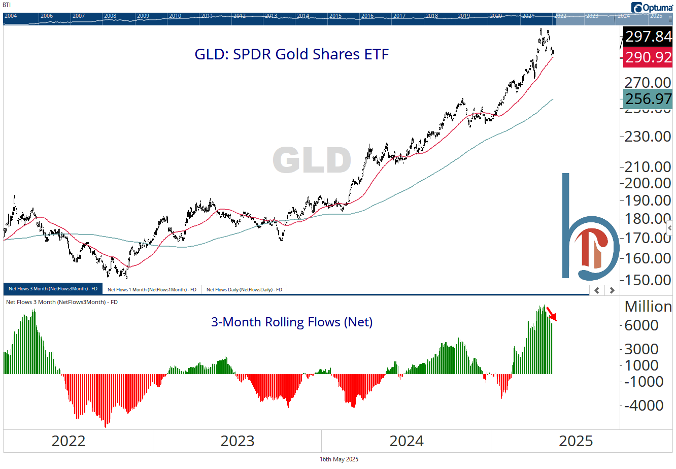 Gold is finally starting to see some outflows over the past two weeks but the trailing 3-month number remains at its highest level since the early 2022 peak. Rolling 1-month flows just flipped negative, and I believe we see more outflows before we want to give gold another look from the long side.