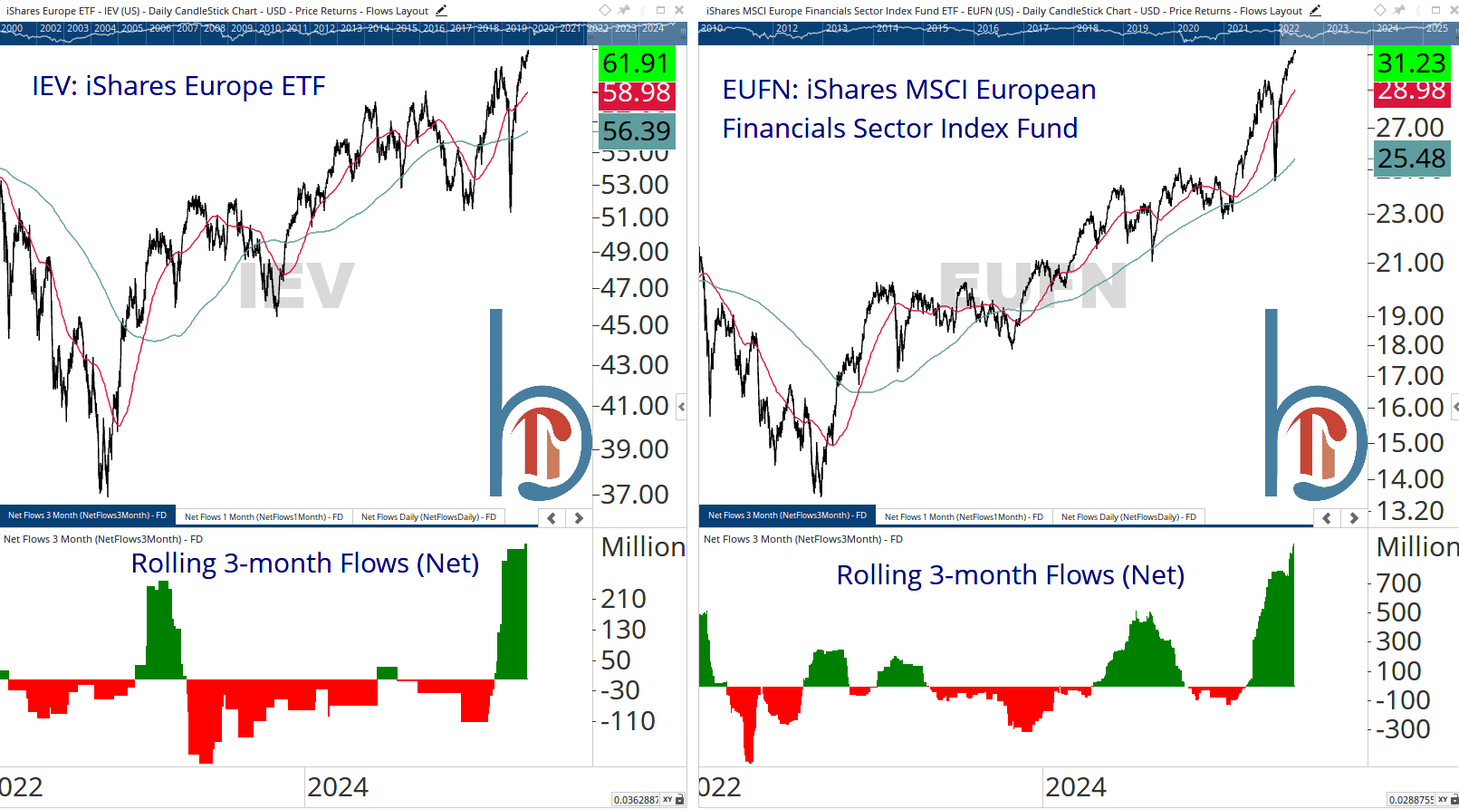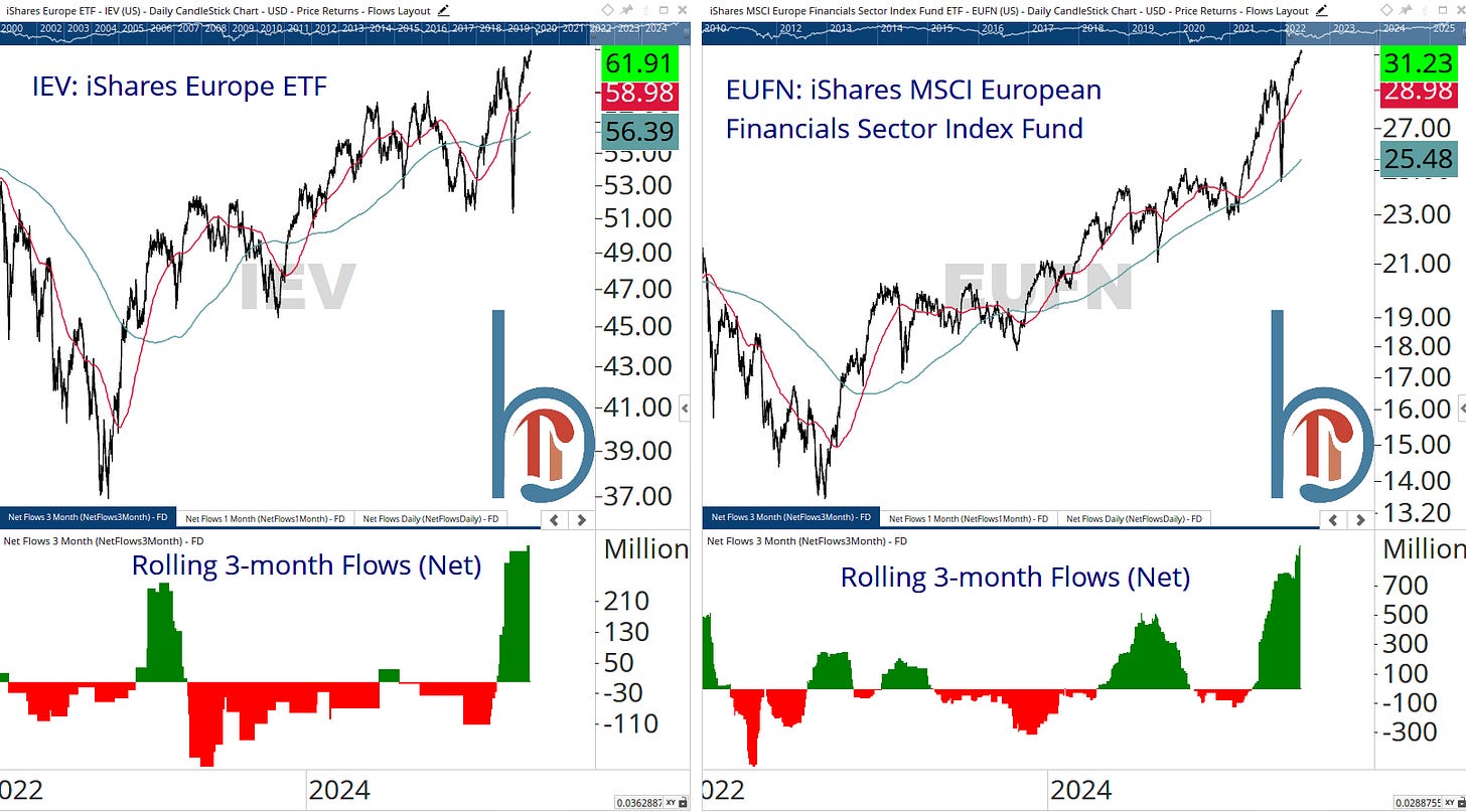 Contrarian positive. These ETFs have seen significant outflows recently and extreme readings could indicate selling is unlikely to continue to the same degree. Potential tailwind if a downtrend can stabilize and a bullish indicator for uptrends or ETFs breaking out.