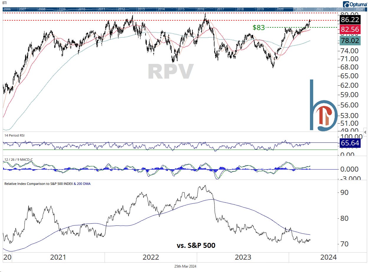 The S&P 500 “Pure Value” ETF is designed to only hold the stocks in the index that are the most “deep value” and then weighted according to which of those exhibit the strongest value characteristics. Even though the last 6 weeks have been especially favorable, RPV has only managed to keep up with the index. Support at $83 but I’d rather own IWD.