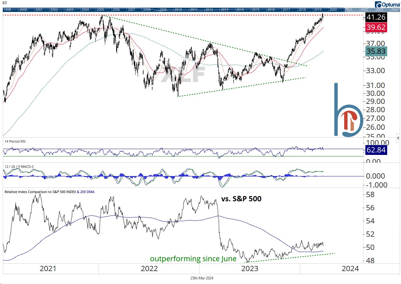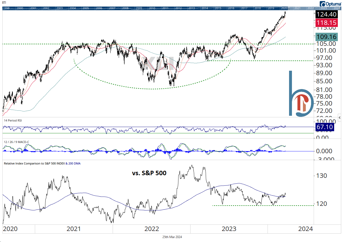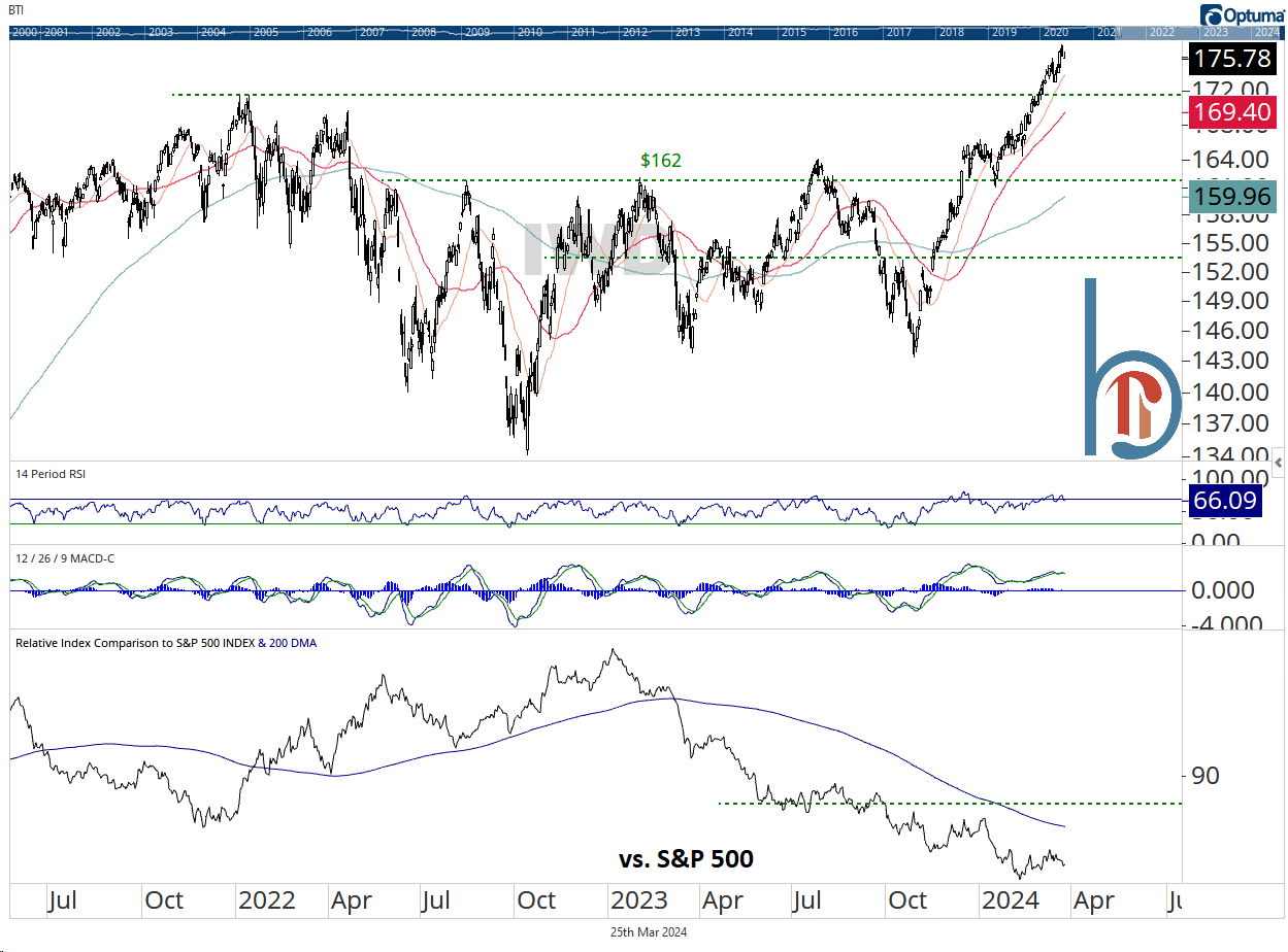 IWD has decisively broken out to new highs and (like the S&P 500) is riding its 21-DMA. While it has managed to slightly outperform over the past 6 weeks, with the relative chart below a downward-sloping 200-DMA, we need to be highly skeptical of its ability to outperform. $171 is first support.