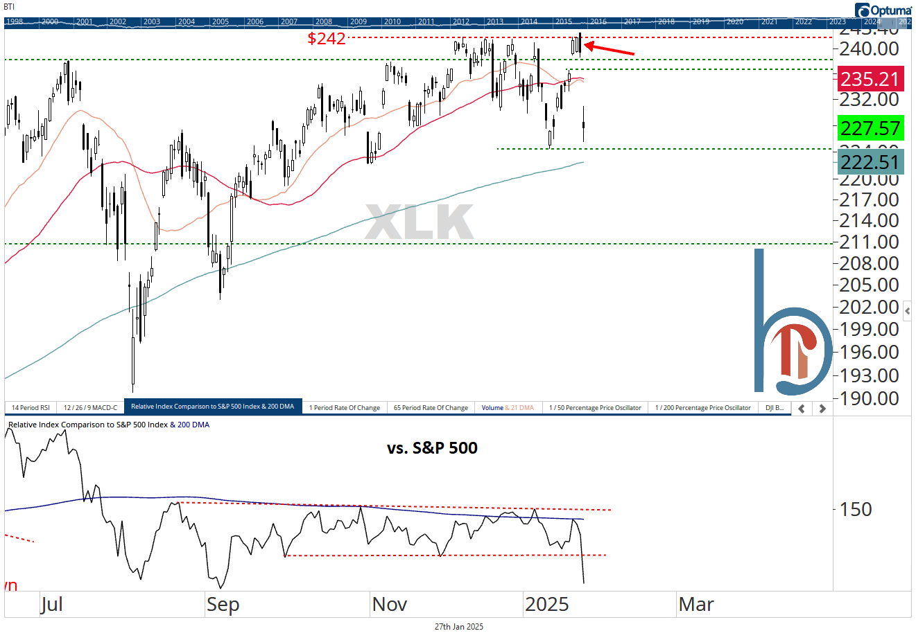 Yesterday’s Monday Morning Playbook called out Friday’s bearish engulfing candle for XLK, and that was no doubt confirmed by Monday’s 4.9% decline. XLK did see a bounce off its January lows ($224.45) and the zone between there and the 200-DMA ($222.51) now becomes critical support.