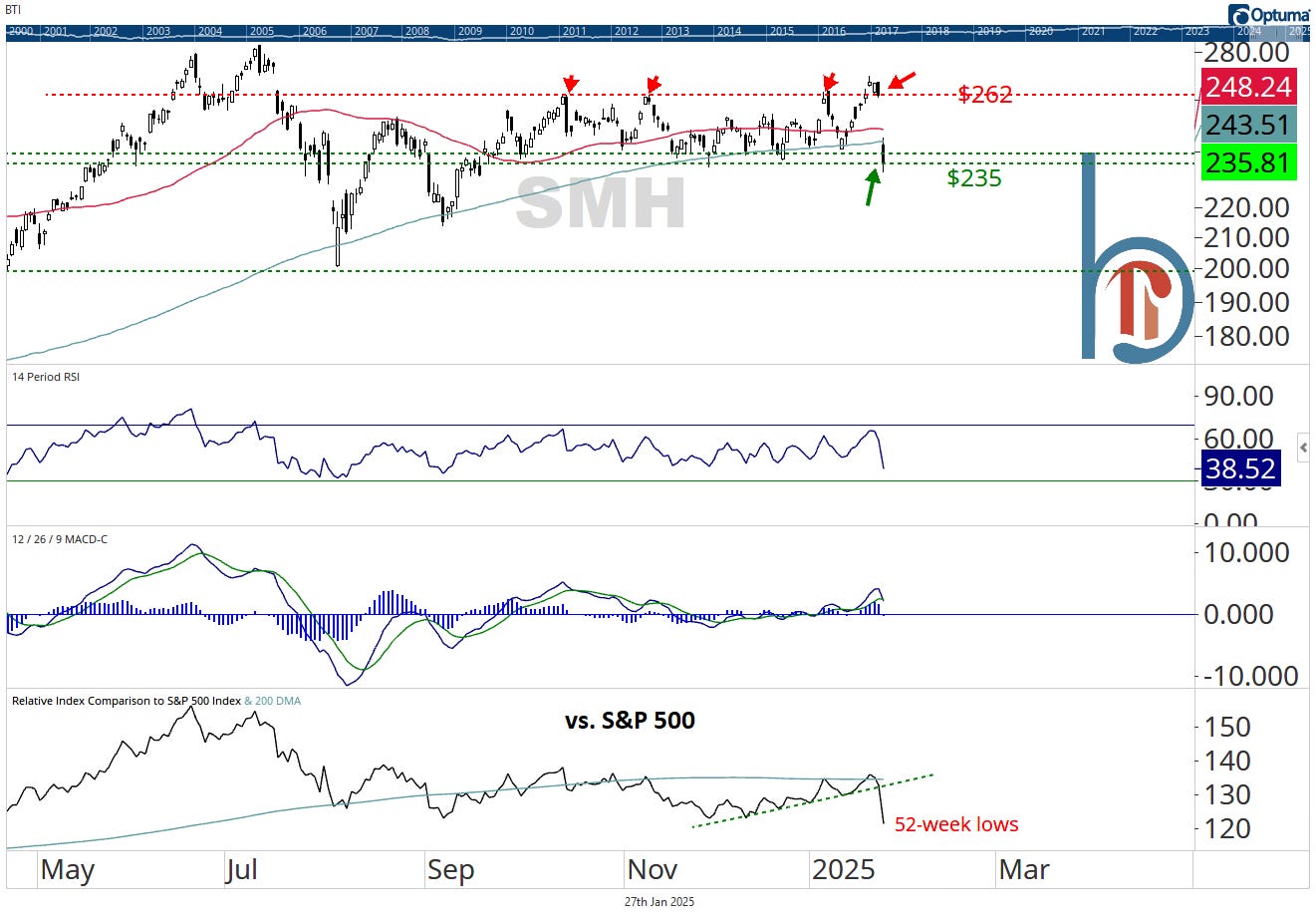 Of all the focused ETFs I track, only nuclear/uranium stocks were worse than semiconductors which suffered their worst day since the Covid crash. SMH went from breaking out and showing some relative improvement to below its 200-DMA and 52-week relative lows. After losing the 200-DMA (held 4-5 tests over the past year) SMH has to hold $235. A break of this level would suggest a risk to $200.