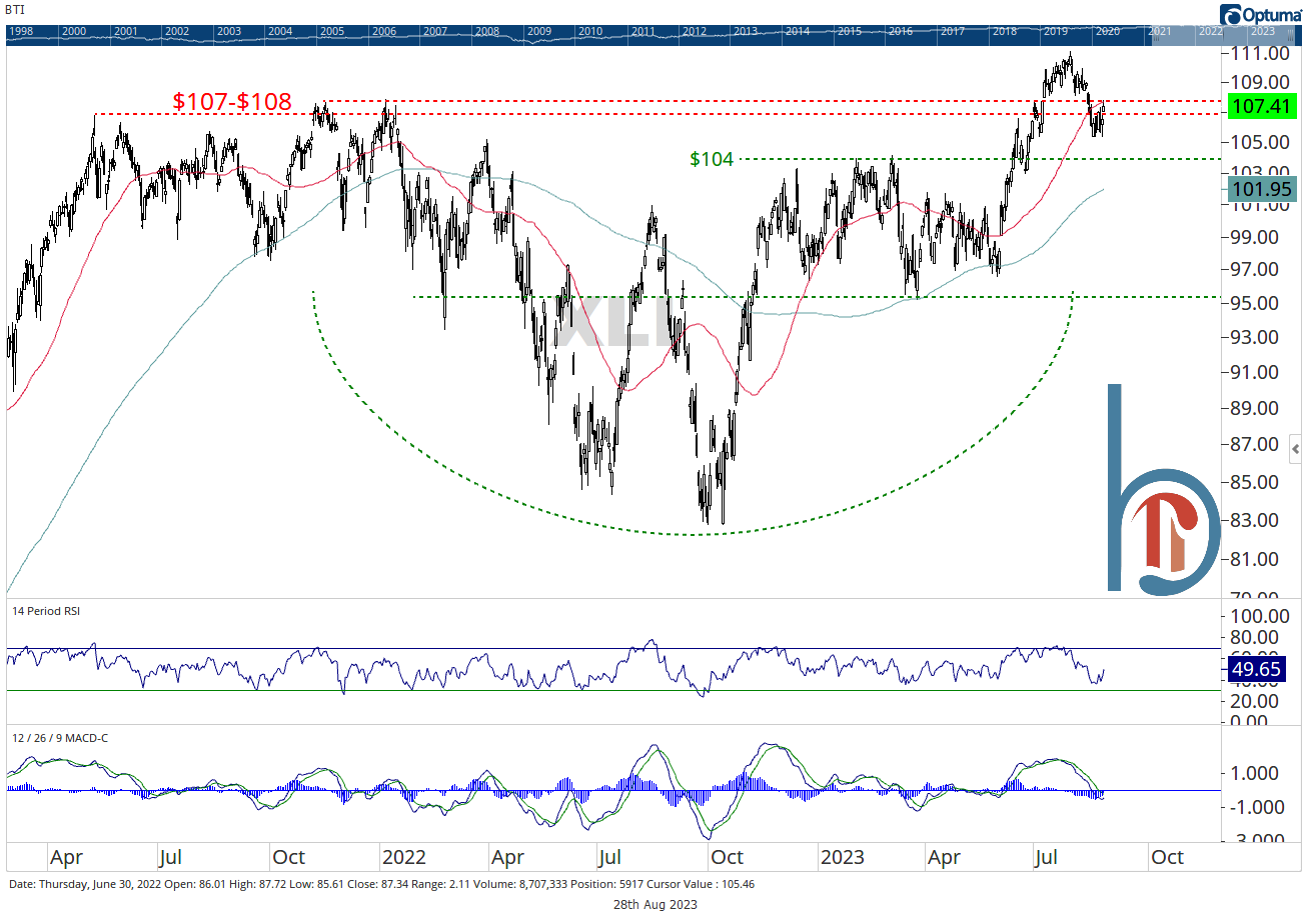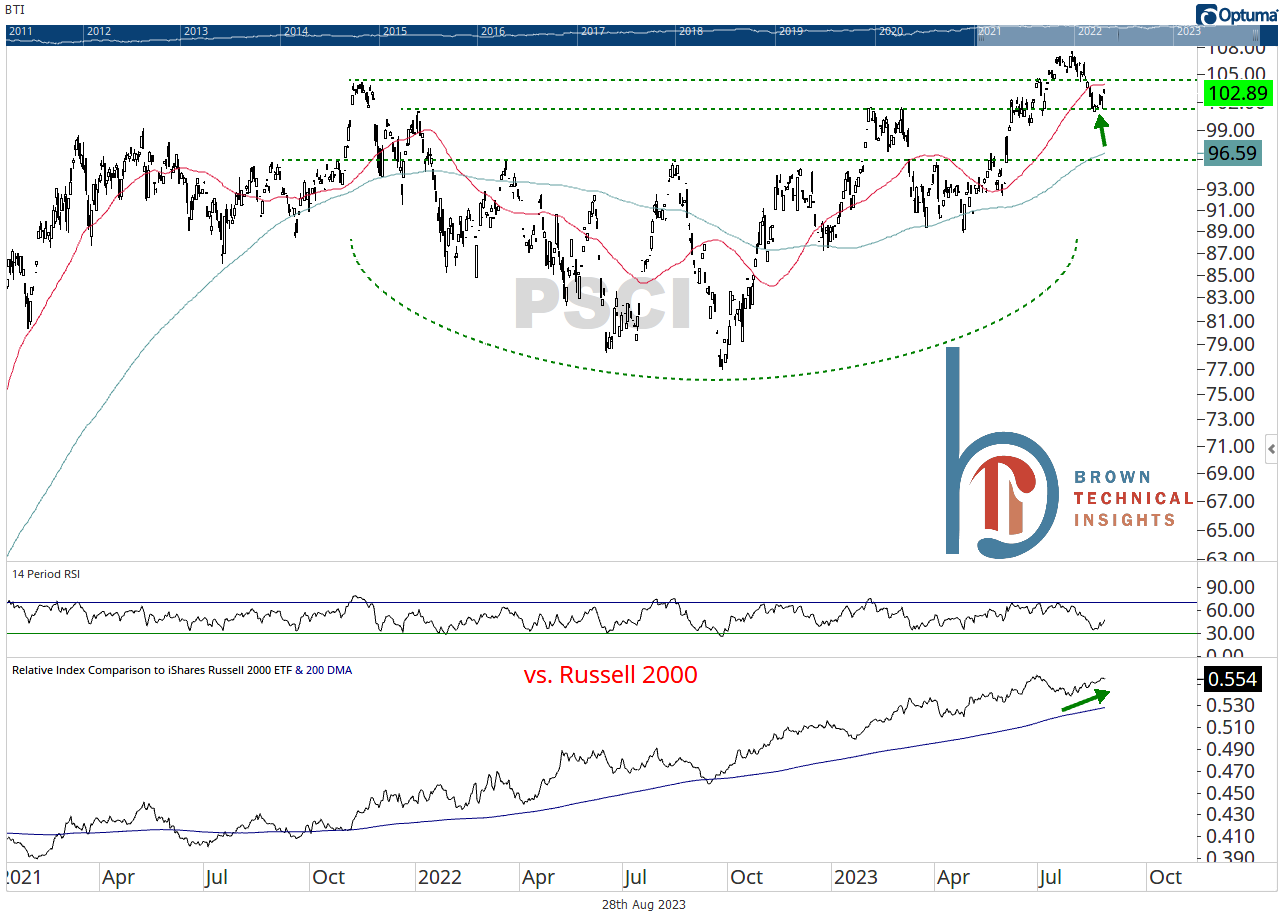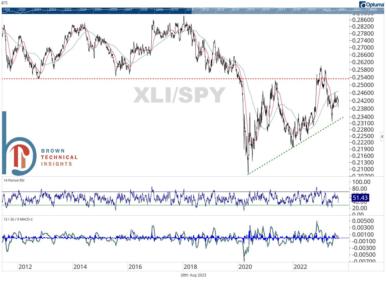 The absolute chart of XLI remains technically constructive. While the sector has pulled back and is trying to recapture its 2021 highs, it held above the $104 breakout level from earlier this year. RSI momentum failed to get oversold (a good sign) and the daily MACD is on the verge of flipping positive. Longer-term, this base measures to about $131/share.