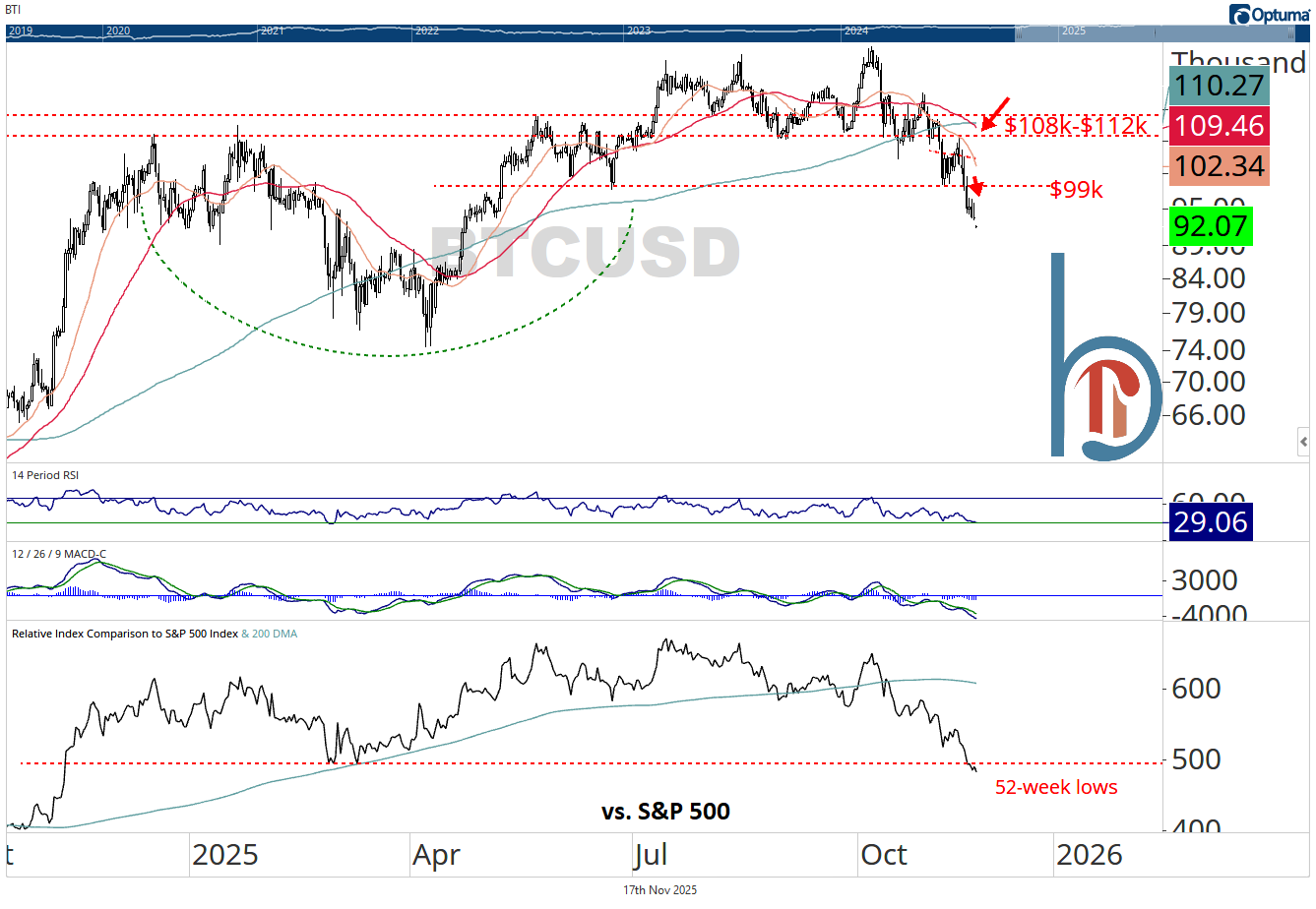 Now, that doesn’t mean it’s the end of the world or it has to go down significantly from here, but for my time horizon, the technical case for owning Bitcoin doesn’t exist. The crypto hit fresh six-month lows yesterday, completed a top when it broke below $108k and the 200-DMA in late-October, and affirmed that level as resistance when it failed on a retest last week. In addition, the 50-DMA just crossed below the 200-day, a clear sign that the intermediate-term trend has turned against it.