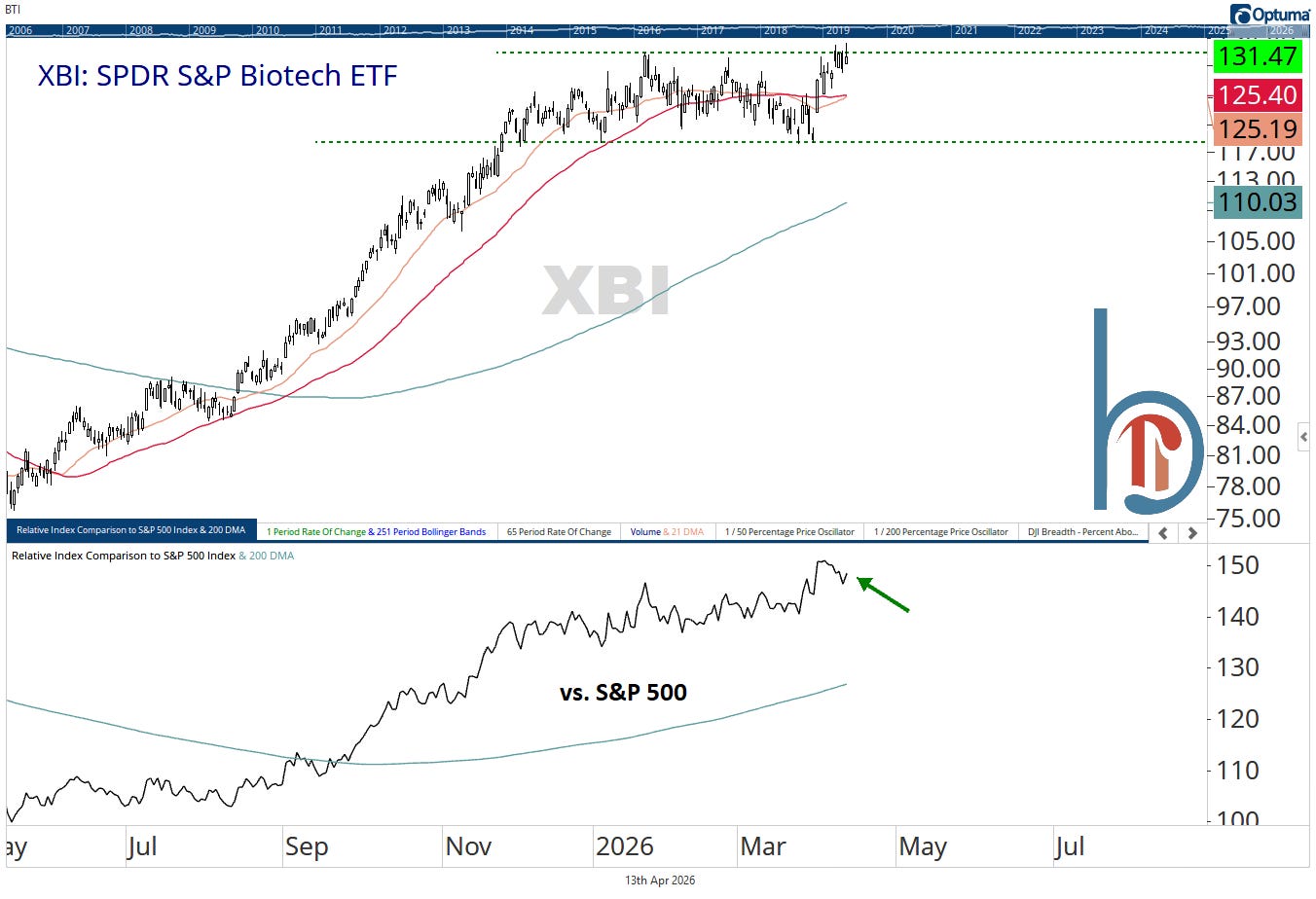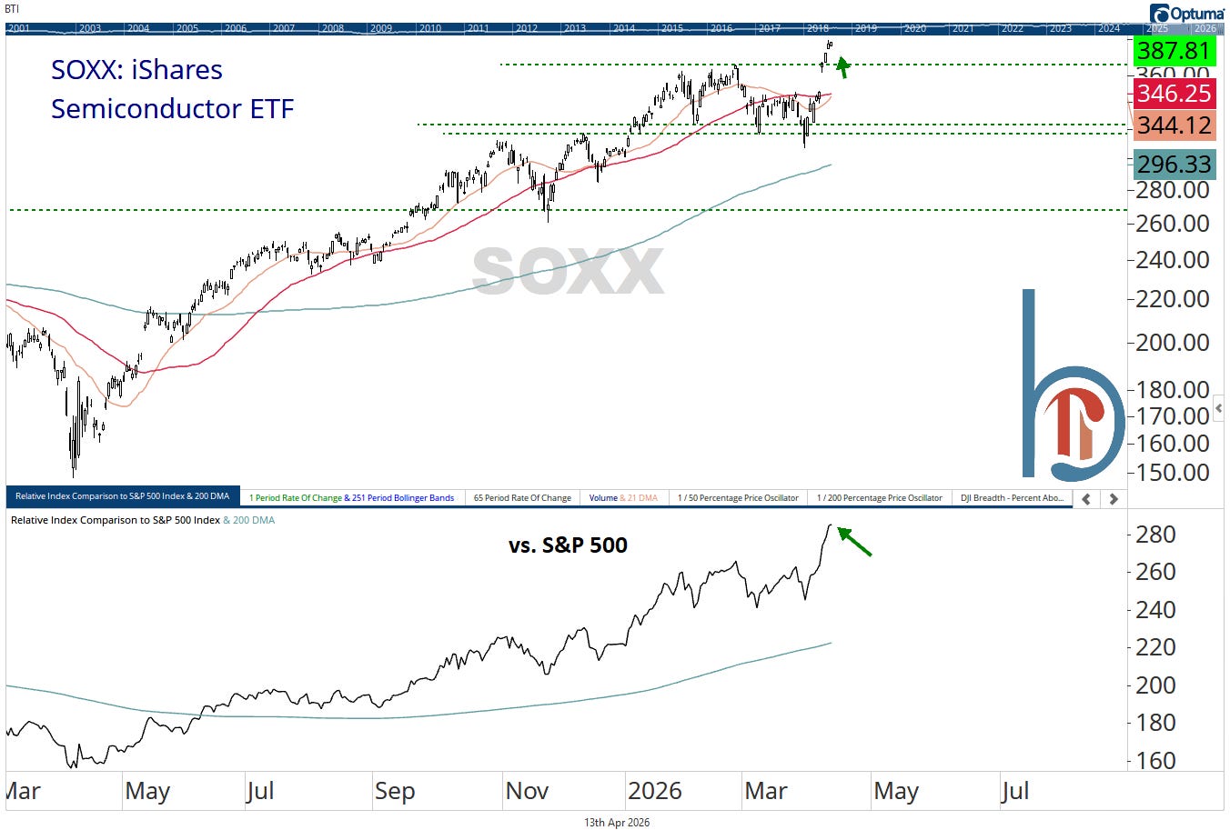 SOXX didn’t just hit new relative highs last week, it broke out to absolute highs. Taiwan Semi earnings (Thursday before the bell) will be important to how this group finishes the week, but the recent rotation from the memory names to the index heavy-weights like Broadcom and Nvidia certainly seems healthy.
