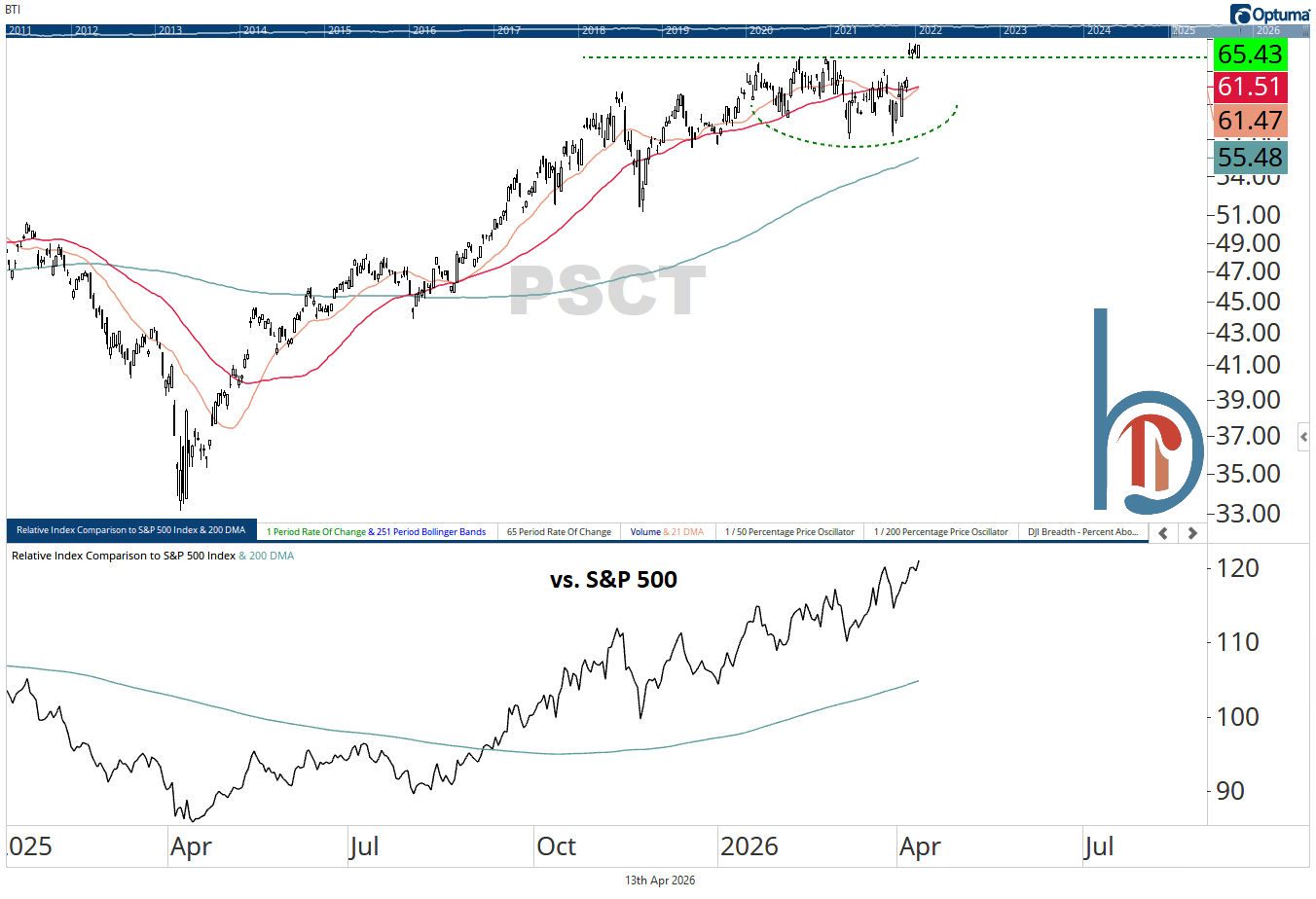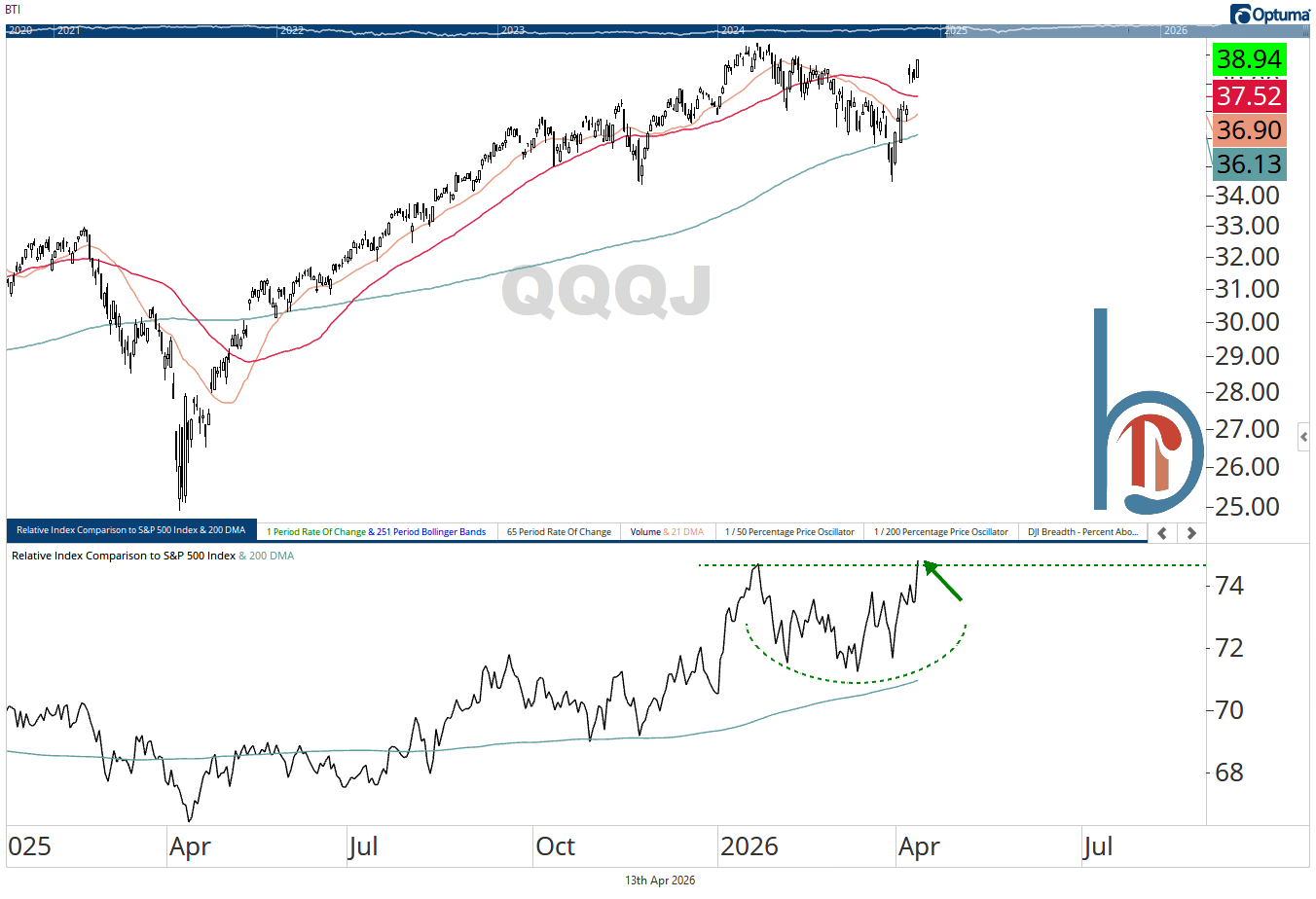I think of the NASDAQ NextGen 100 ETF as having a lot of software names, but clearly that isn’t the case. Led by top holding Sandisk, QQQJ broke out to a 52-week relative high vs. the S&P 500 yesterday, and the base suggests more outperformance is on deck.