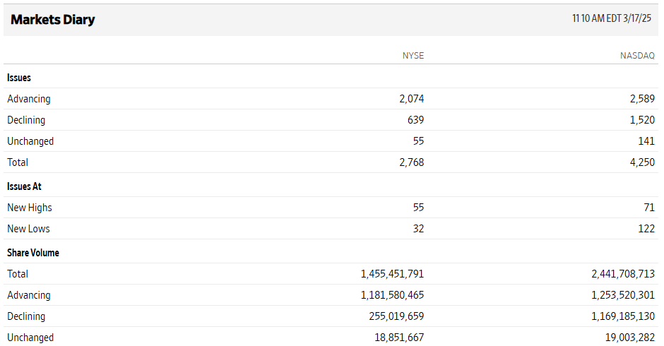 Two hours into trading, advancing stocks outnumber declining stocks by 3:1 on the NYSE but less than 2:1 on the Nasdaq. Small caps (+0.9%) are leading while the Nasdaq (-0.2%) is slightly lower, highlighting the disparity in breadth improvement noted in today’s Playbook.