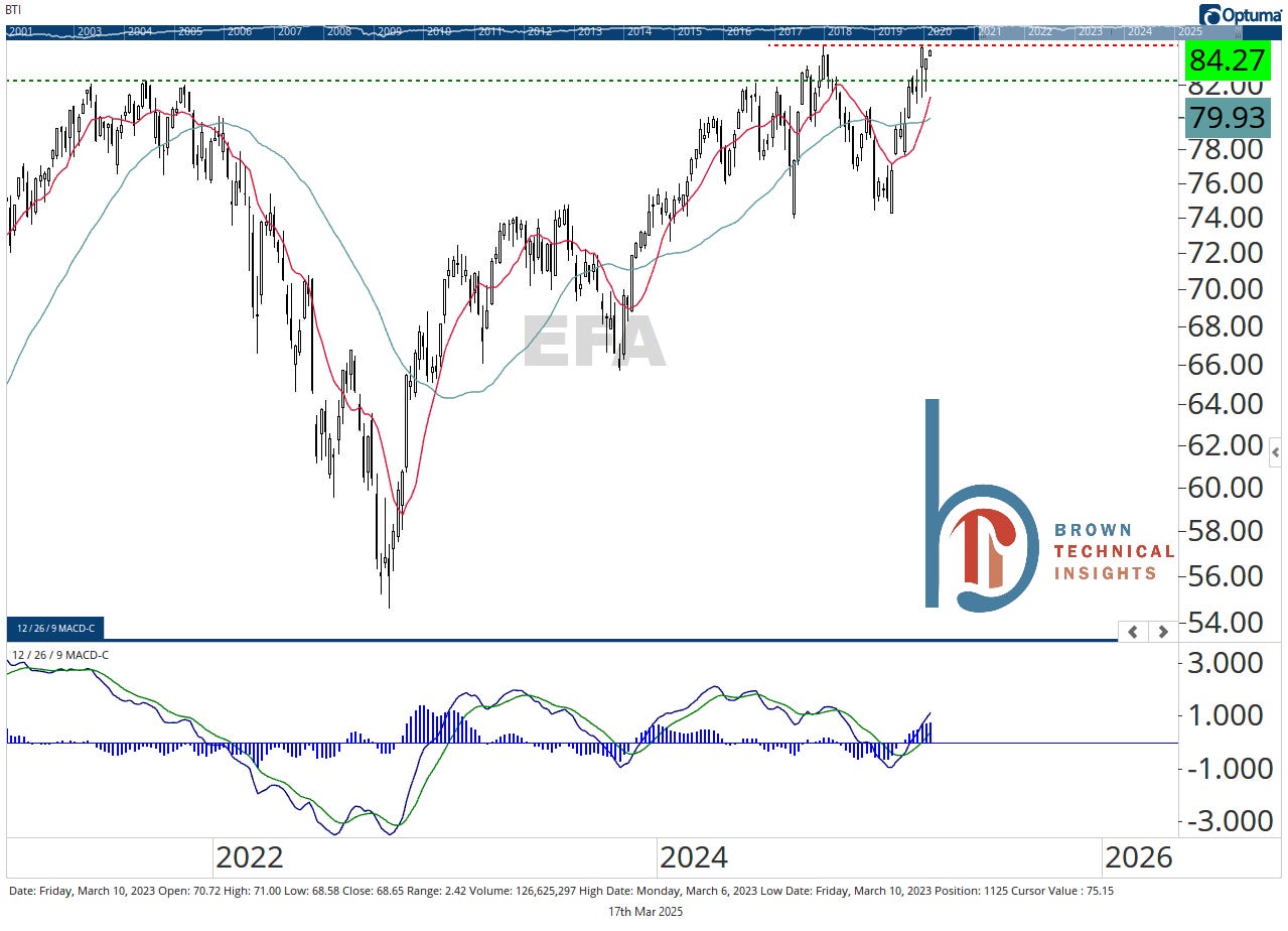 Foreign developed markets are higher to start this week and knocking on the door of a breakout from a 6-month consolidation. $84.56 is the magic level for EFA.