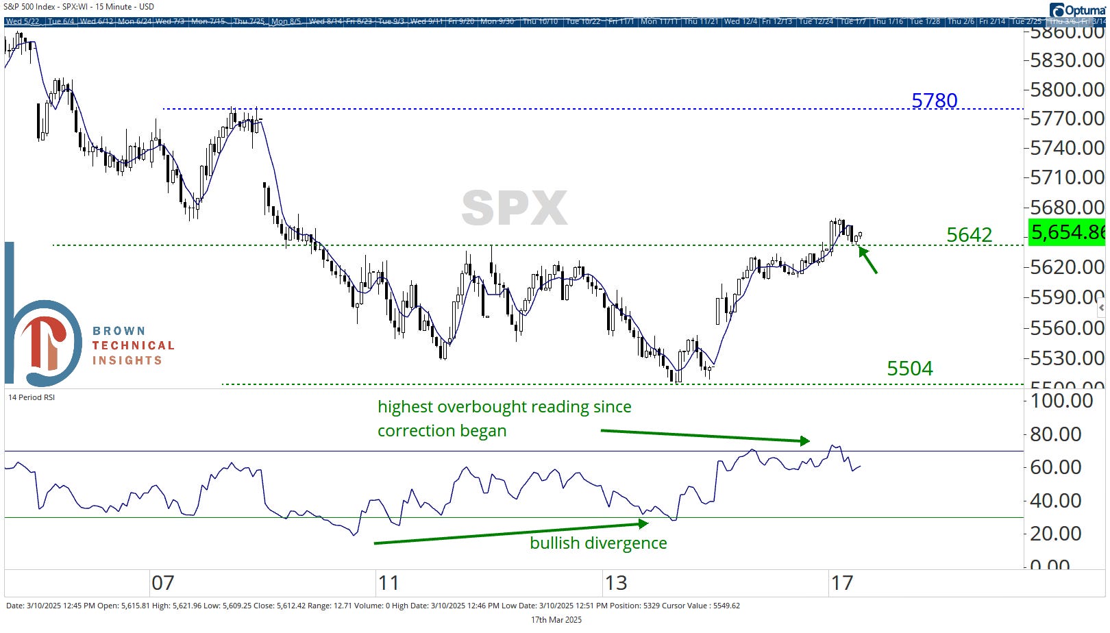 It’s early but as of 11:15 am ET, the S&P 500 has broken out above this week’s level to watch, 5642. This makes the first higher high for the index on the intraday chart since the correction began and also its highest overbought reading, a bullish sign. Next steps, holding 5642, and ideally hitting its short-term measured target which is 5780.