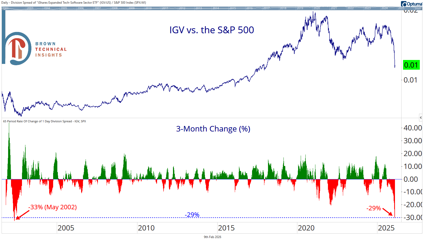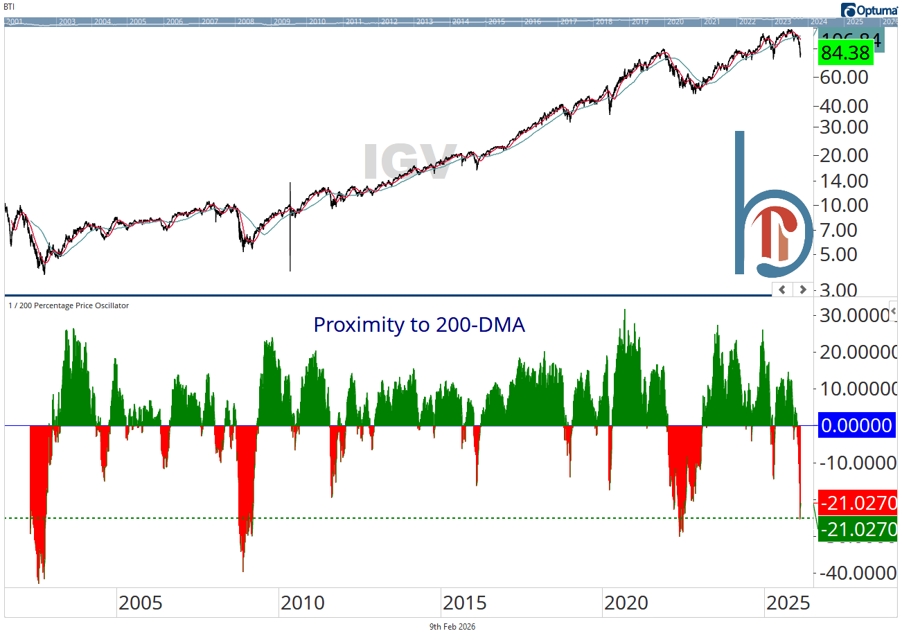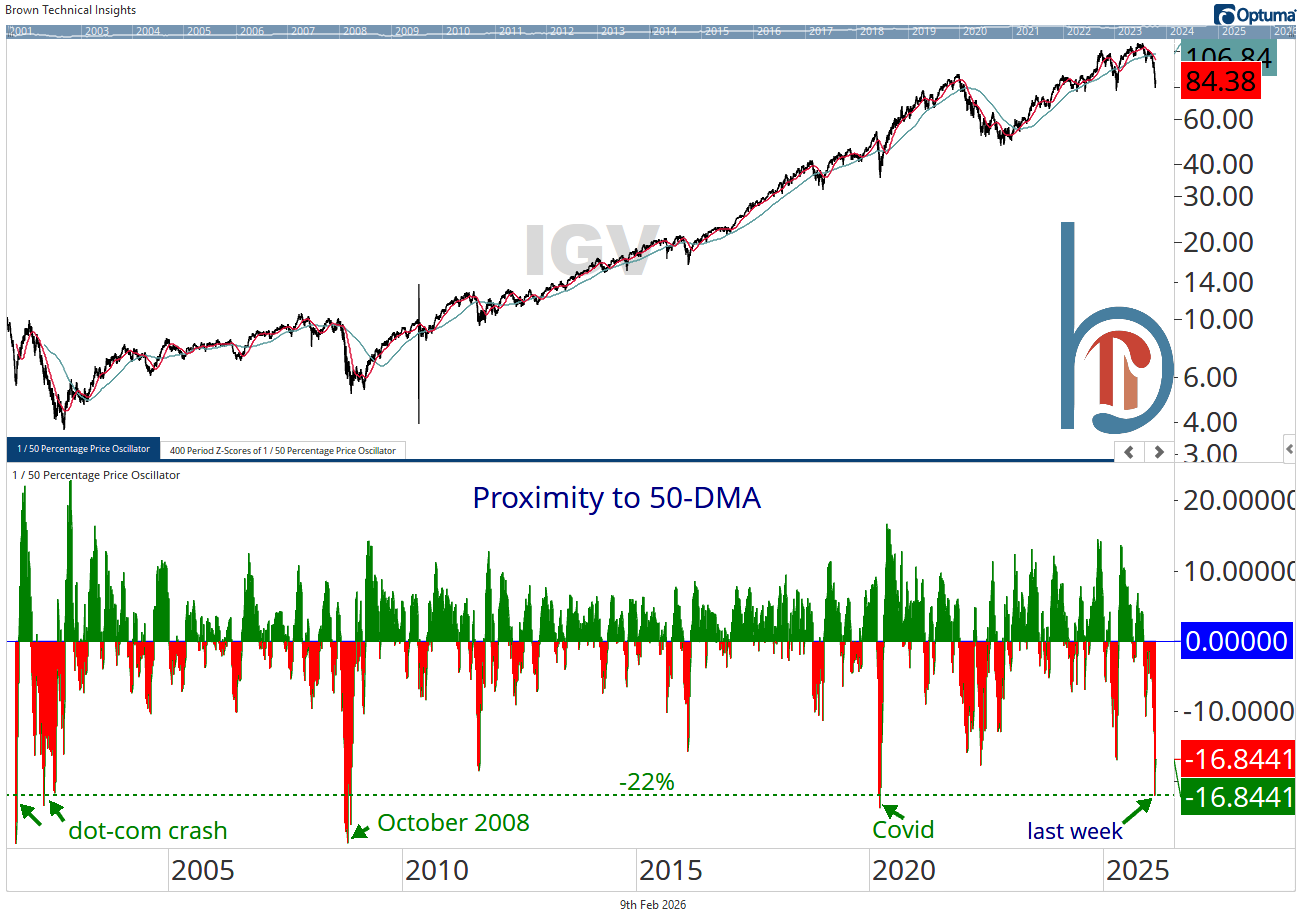 Last Thursday, IGV reached 22% below its 50-DMA, a reading we’ve only seen during the three worst bear markets over the past 30 years.