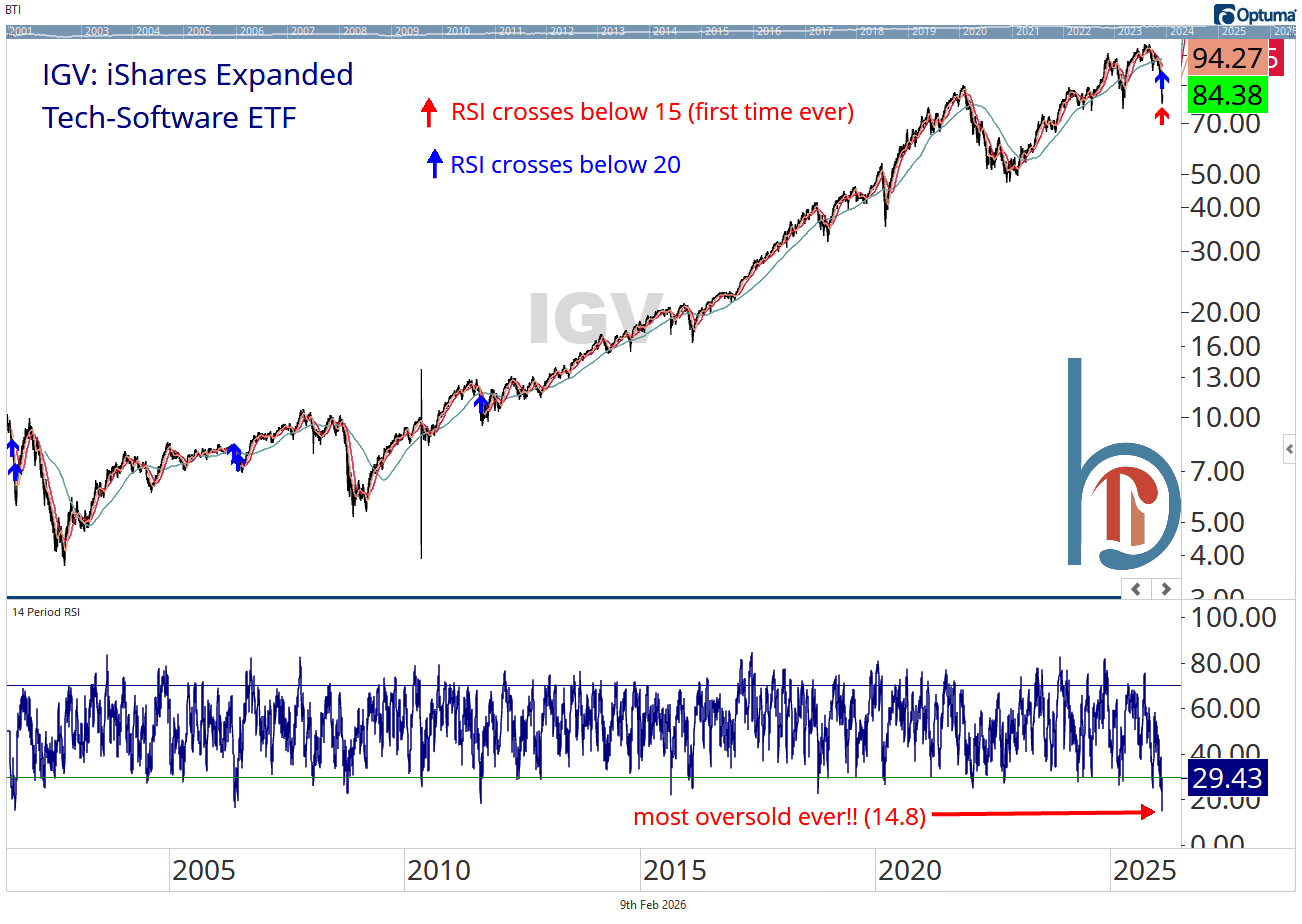 Last week, IGV’s RSI-14 went below 15 for the first time ever. Above in blue are the only other times we’ve seen this oversold reading go below 20.