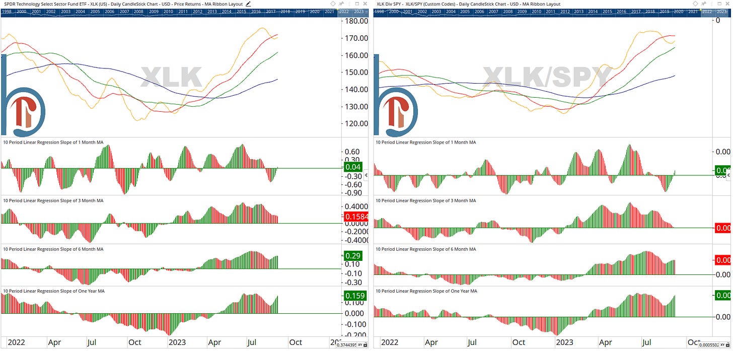 Tech is our leader, with only the 3-month slope of the XLK:SPY ratio currently negative. After a brief correction, the one-month slope is back to positive in absolute and relative terms and long-term trends remain bullish.