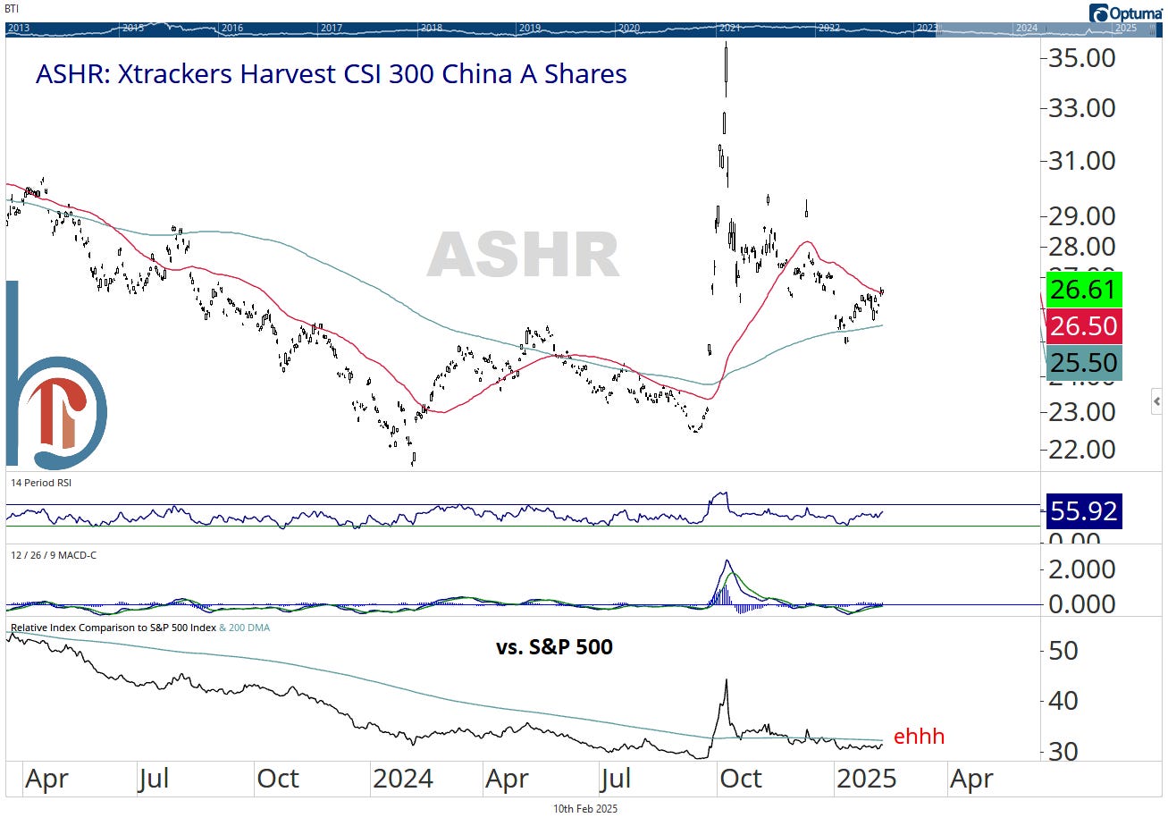 During yesterday’s rally, the next three China ETFs we’re going to look at were all up between 2.6%-3.3%. ASHR was up just 0.6% and the underperformance isn’t a new trend. It’s still below the 200-DMA vs. the S&P 500 and is 25% below its October highs.