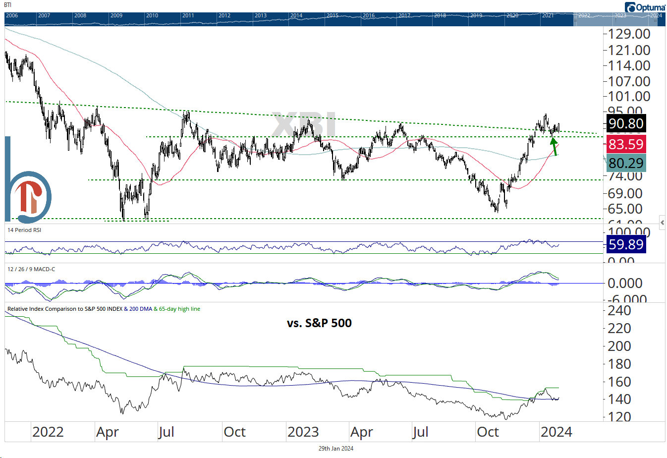 I like biotech and I especially like it within the healthcare sector, where the top managed care names have continued to struggle. XBI is breaking out of a 2-year base and just a few weeks removed from a 3-month relative high. I view the recent action as a healthy consolidation and expect higher prices in 2024. From a trader’s perspective, I would use the recent lows at $86 as a stop for new positions.