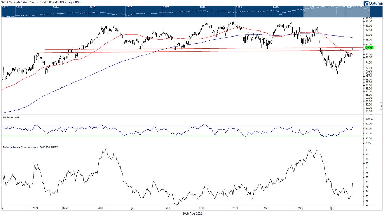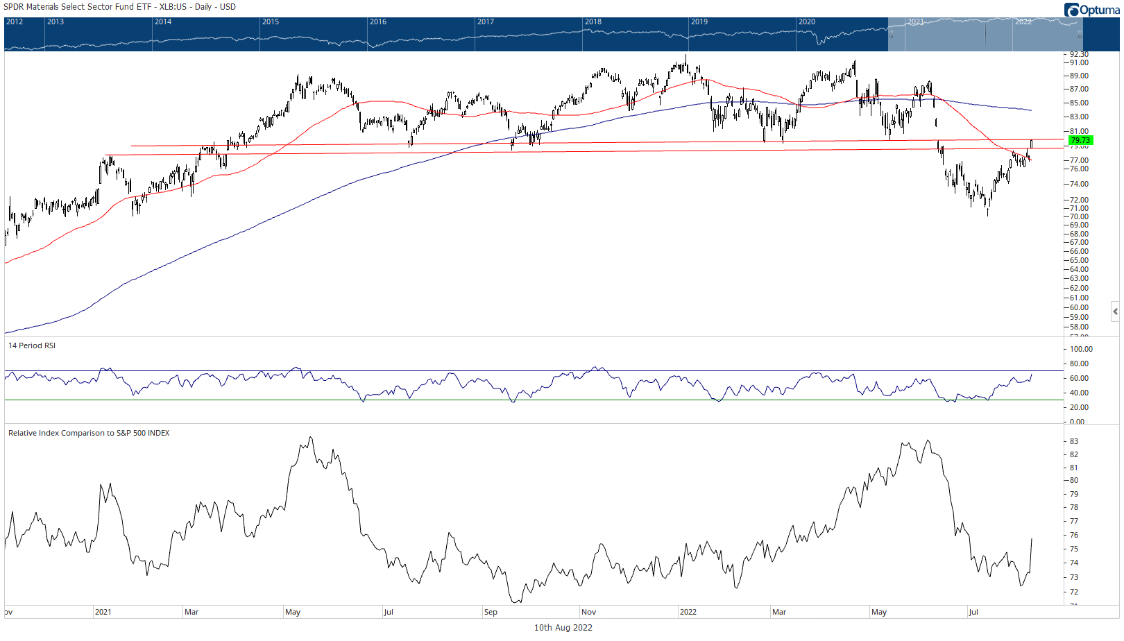 XLB: The materials sector is up into resistance, clearing recent highs, but so far still short of the May lows. It also remains below a downward sloping 200-dma.
