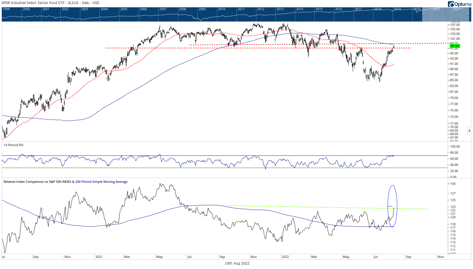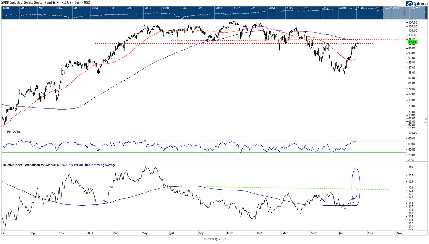 XLI: 52-week relative highs are nothing to ignore, even with the sector historically most-correlated to the broad market. Strong gap today up above the early-June highs, but (again) hard to be excited about jumping back into the range and still having to do battle with a downward sloping 200-dma. I don’t know what the future holds, I just know this is a bad entry point.