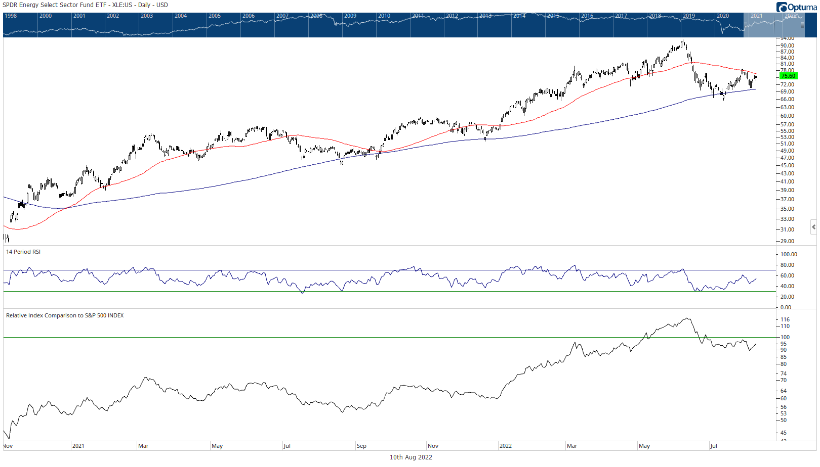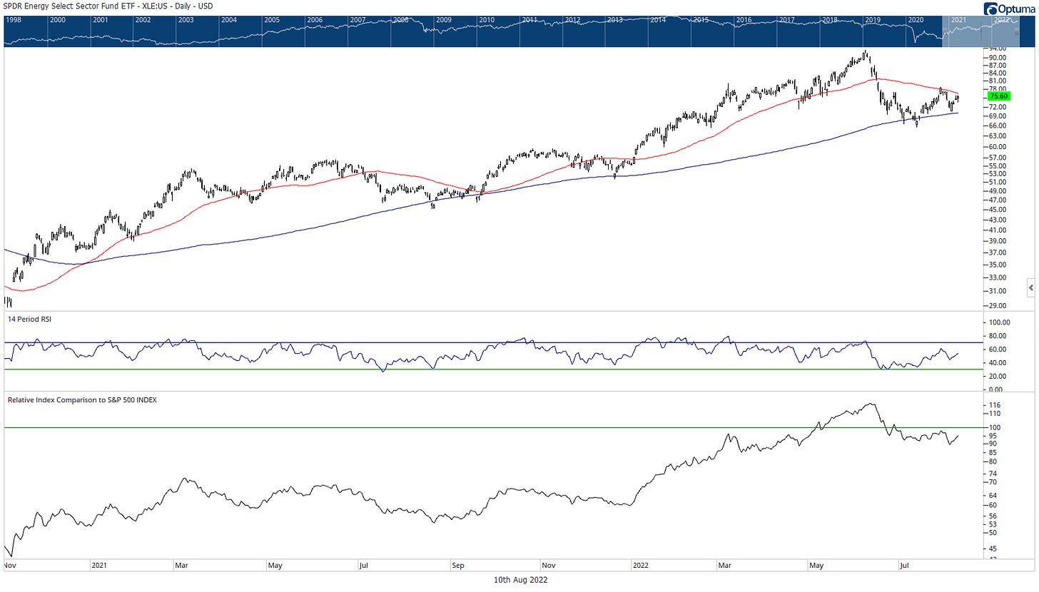 XLE: Energy remains trapped in no-man’s land, between a rising 200-dma and a falling 50-dma. More resilient than crude oil which has recently broken down, but nat gas’s failure to break through May’s highs has us extra cautious.