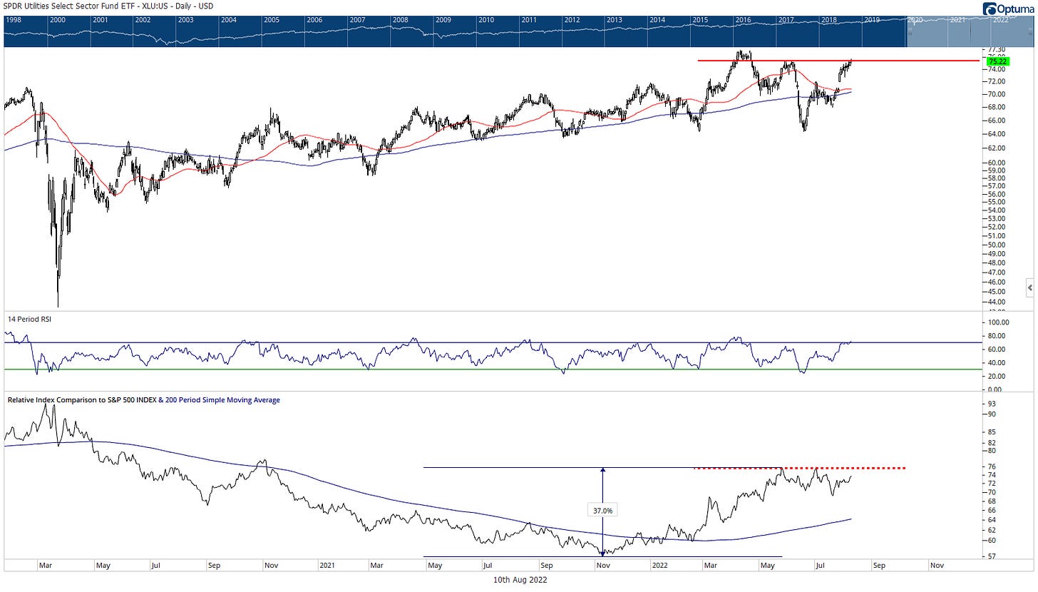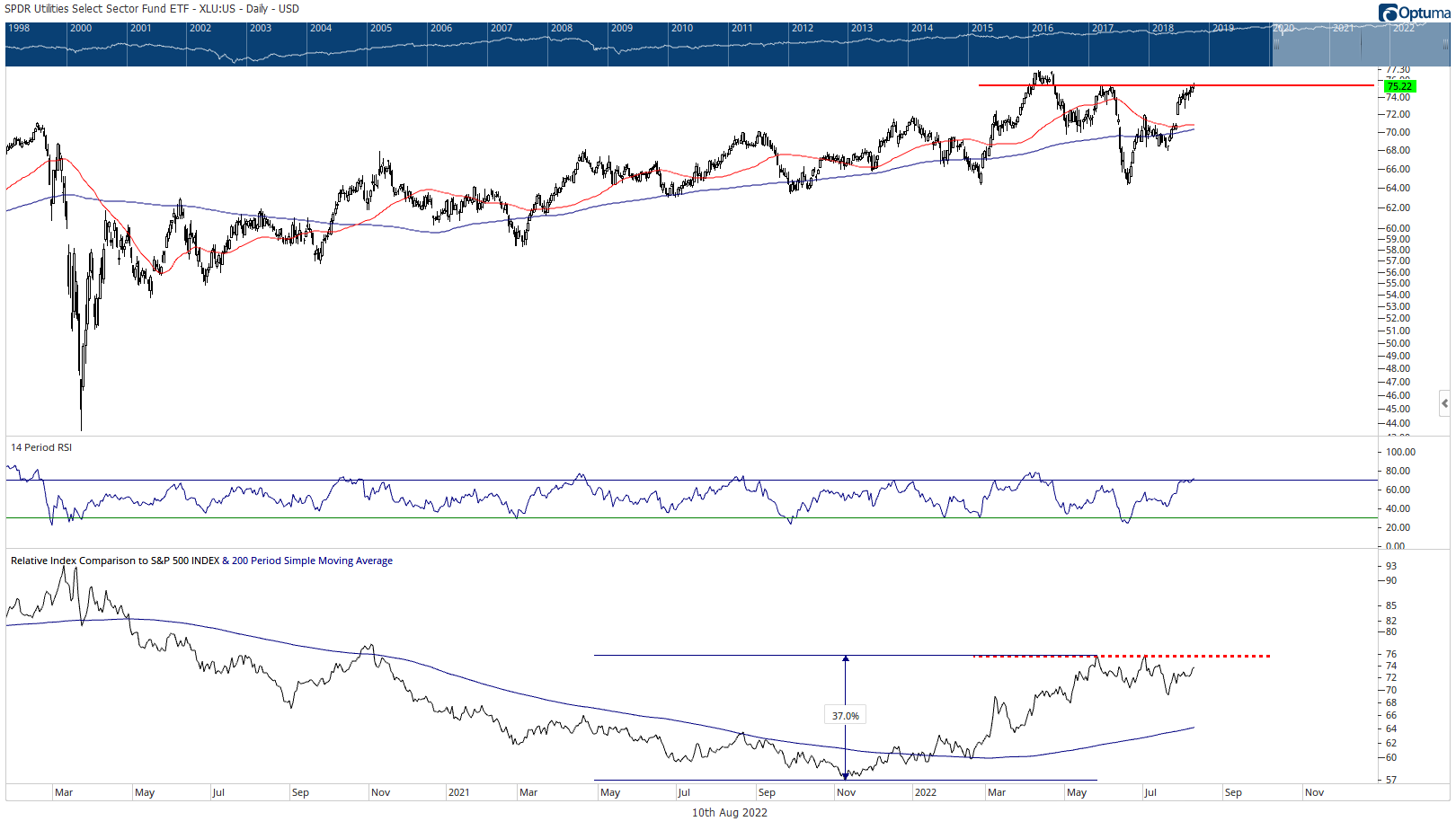 XLU: $75.35 is the magical level that separates XLU from making a run at all-time highs and for now, it looks like it may not get there. Still a relative leader, though consolidating after outperforming the SPX by 37% from November through early-May.