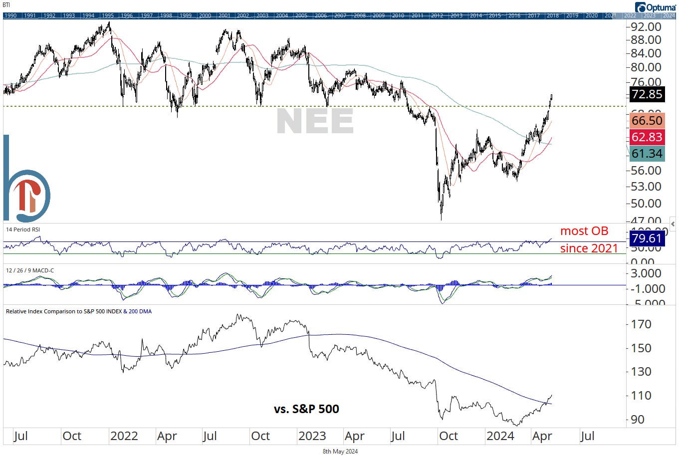 Our ETF portfolios recently added XLU, covering an underweight position following the sector’s 3-month relative high. That’s been the right call so far, with the sector up another 2.7% this week but be careful chasing individual names. Many stocks (like NEE below) are reaching their highest overbought readings in years. That’s a long-term bullish sign of demand but a tactical concern.