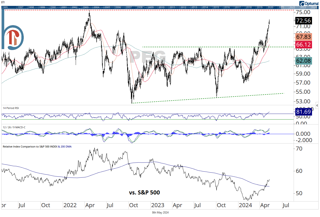 PEG has broken out from a base that targets the 2022 highs. I think it can get there but the closer you get, the poorer the risk/reward short-term. Better on a pullback or consolidation.