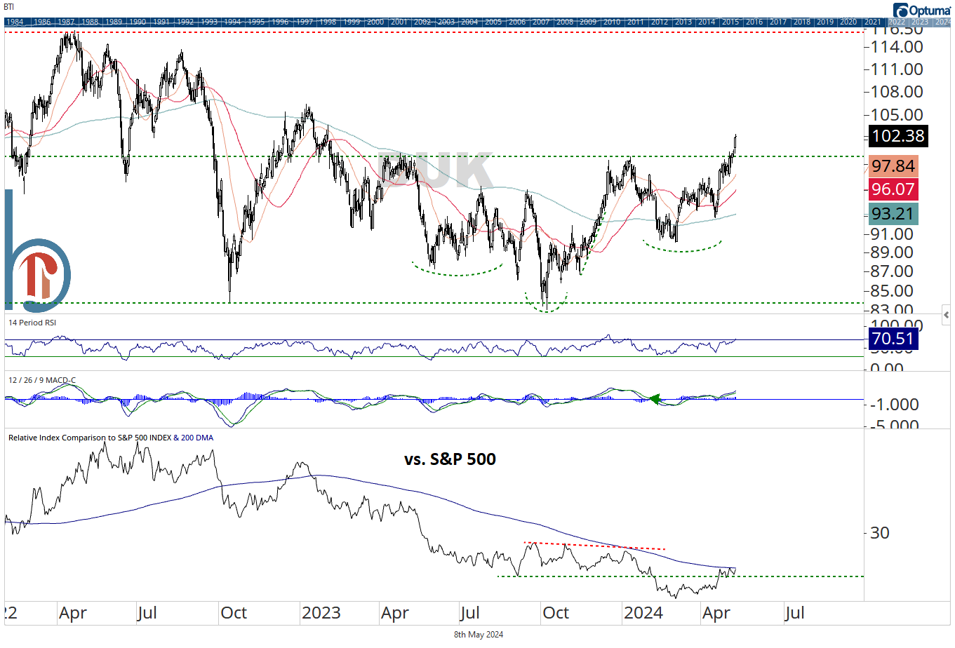 Duke just made the 52-week high list for the first time since it topped in April 2022. In addition, the inverse head and shoulders breakout targets those highs near $116. Duke hasn’t been as strong as the first 2, but is a cleaner technical chart for new money. I would put a stop just below the breakout point, around $97/share.